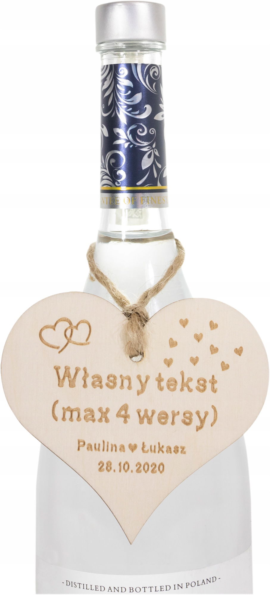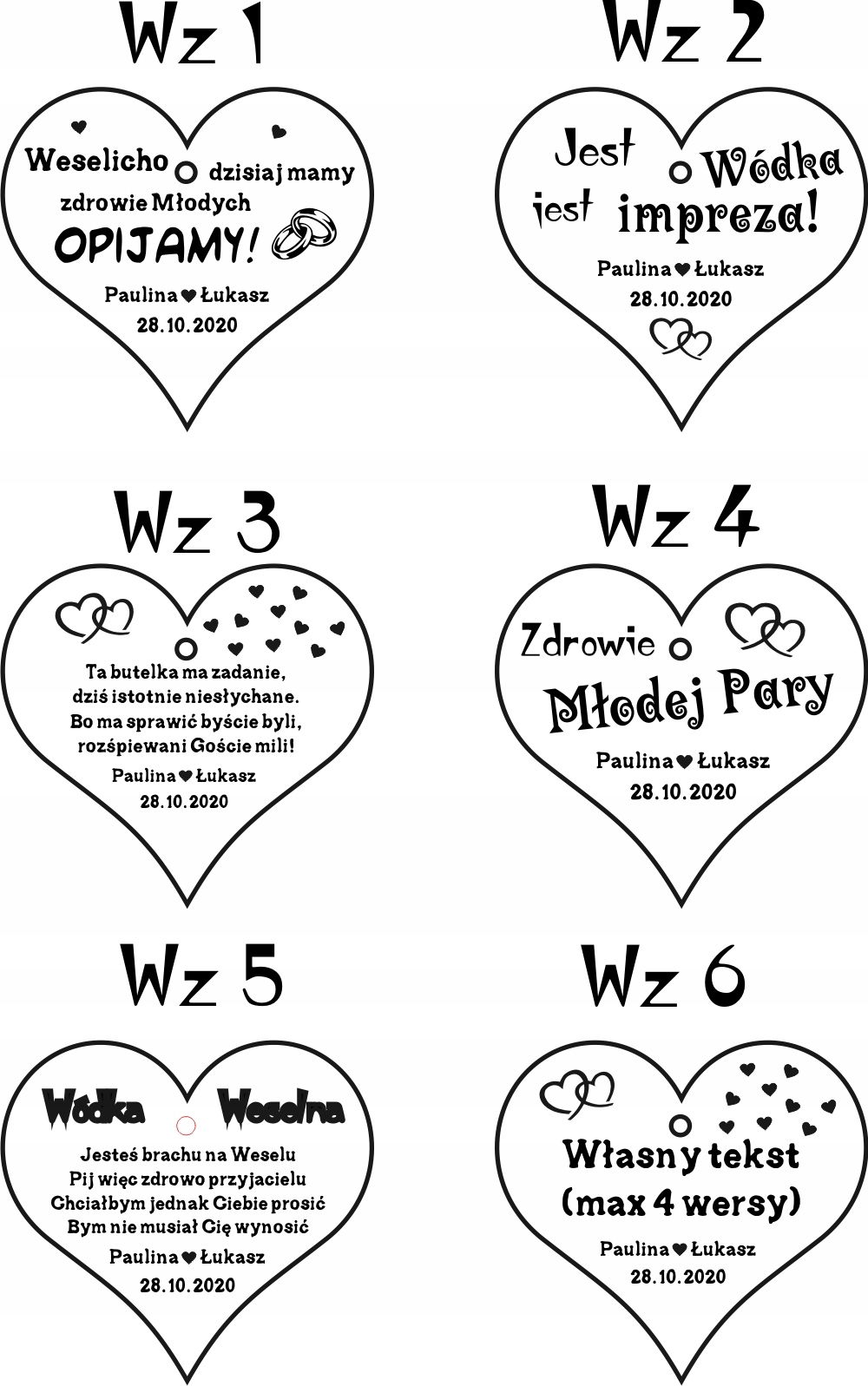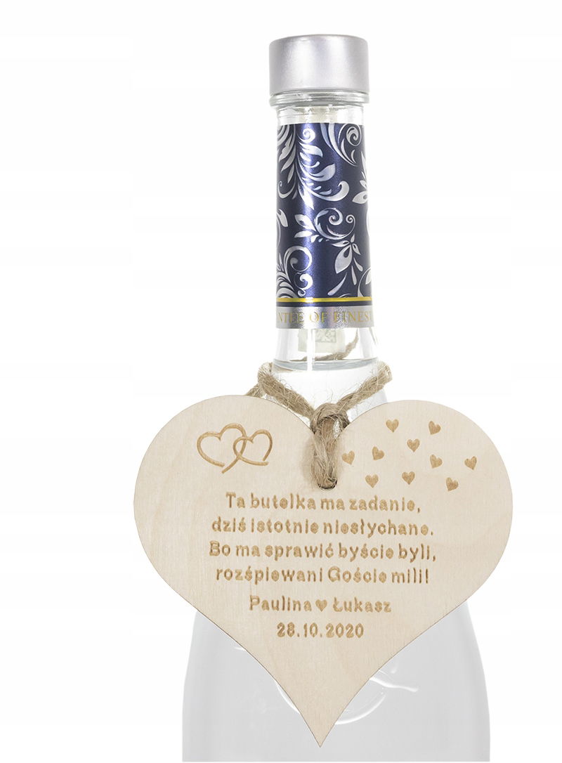 Nietuzinkowe dekoracje na butelki weselne z pewnością wzbogacą weselny wystrój, zainteresują gości, a wesołe teksty zachęcą biesiadników do pierwszych rozmów przy stole.