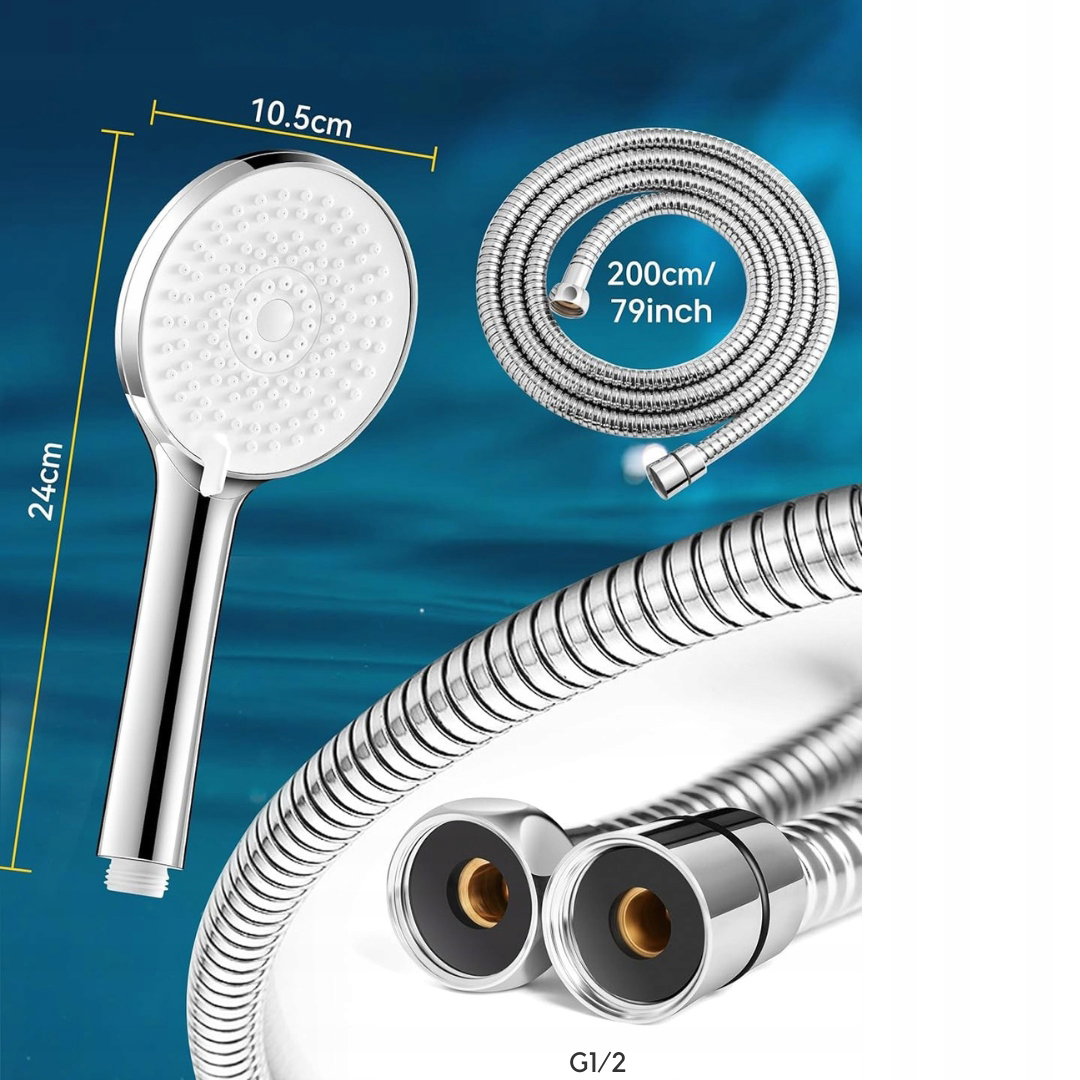 - Uniwersalny wąż prysznicowy: głowica wyposażona w 2-metrowy wąż wykonany z wysokiej jakości stali nierdzewnej z chromowanym wykończeniem. Wąż posiada złącze G1/2 (20 mm), dzięki czemu pasuje do większości standardowych pryszniców.