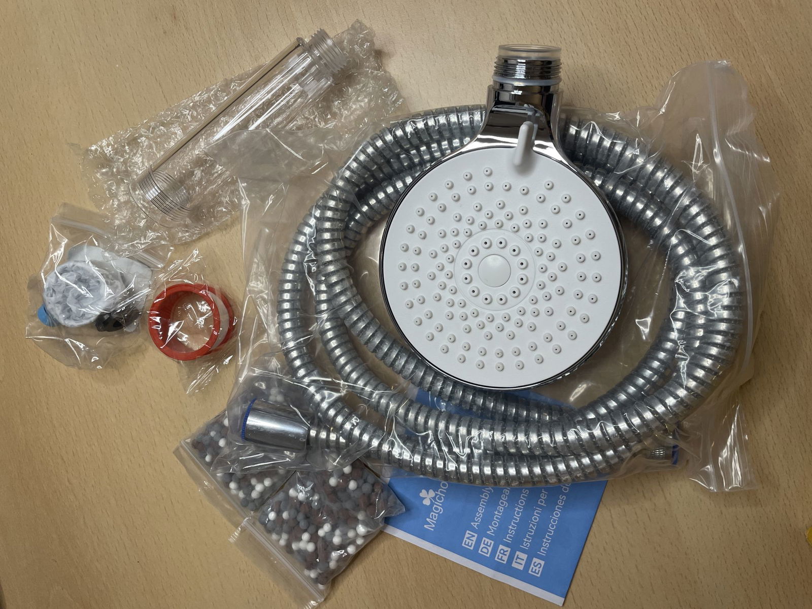 - Kompletny: deszczownica, wąż, uszczelki, pudełko, instrukcja, kamienie mineralne, rączka prysznicowa - to co na foto