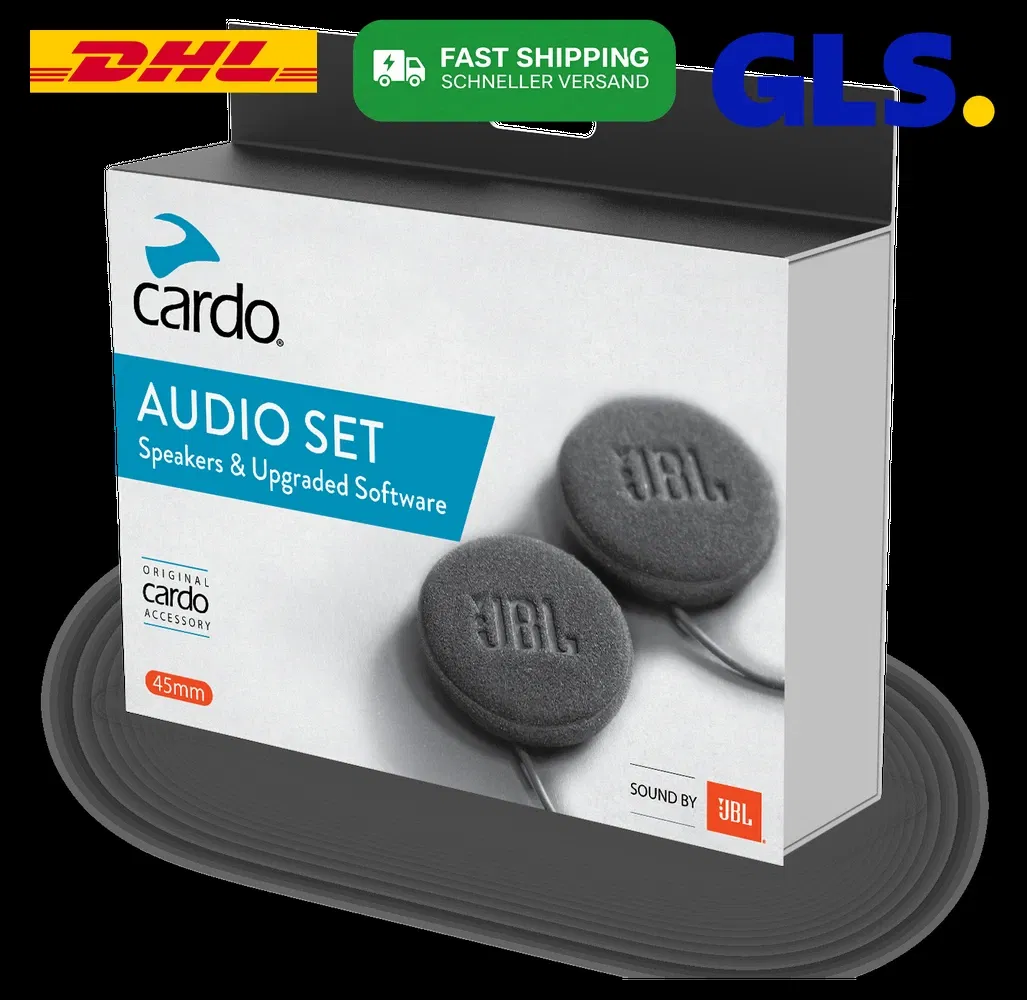 - Dzięki standardowemu gniazdu 3,5mm, głośniki te pasują praktycznie do każdego komunikatora na rynku, bez względu na markę. Właściciele serii Cardo FREECOM i PACKTALK będą cieszyć się dodatkowym wzmocnieniem dzięki nowemu procesorowi dźwięku JBL i oprogramowaniu sprzętowemu.