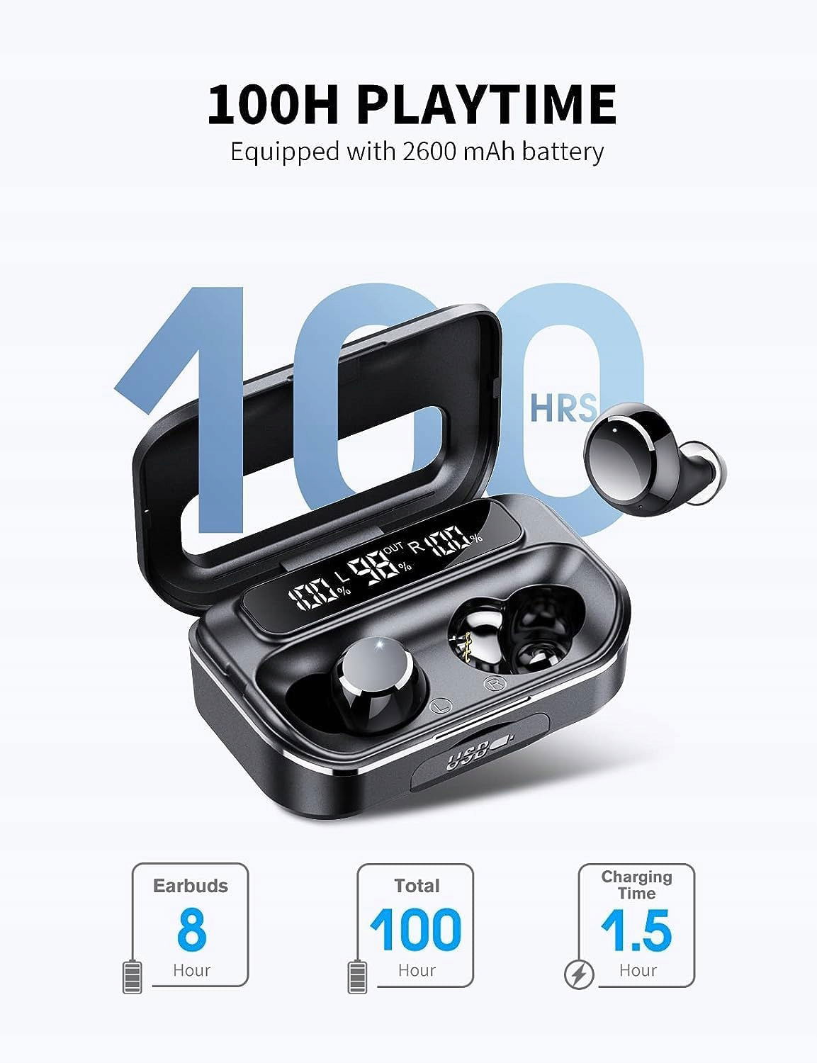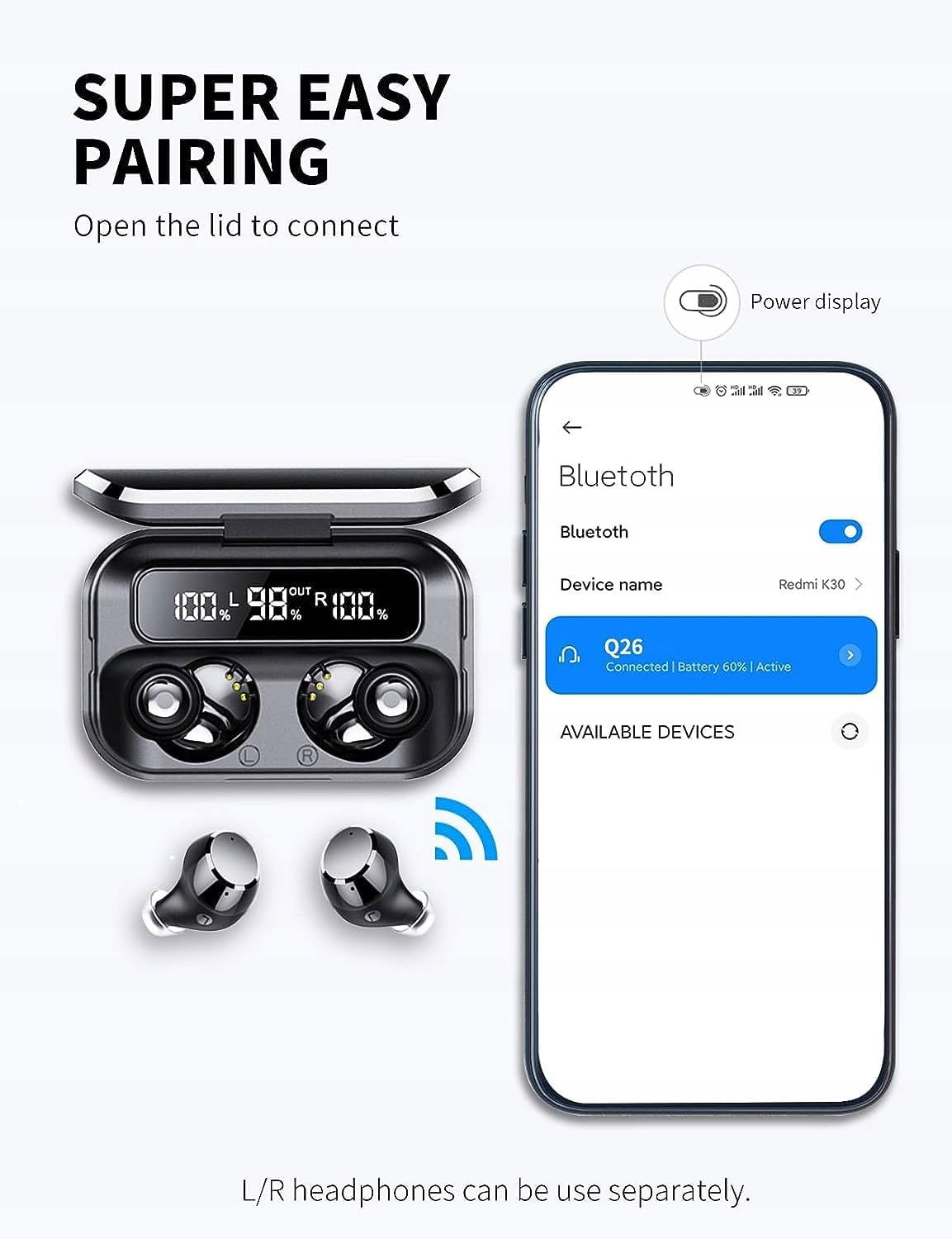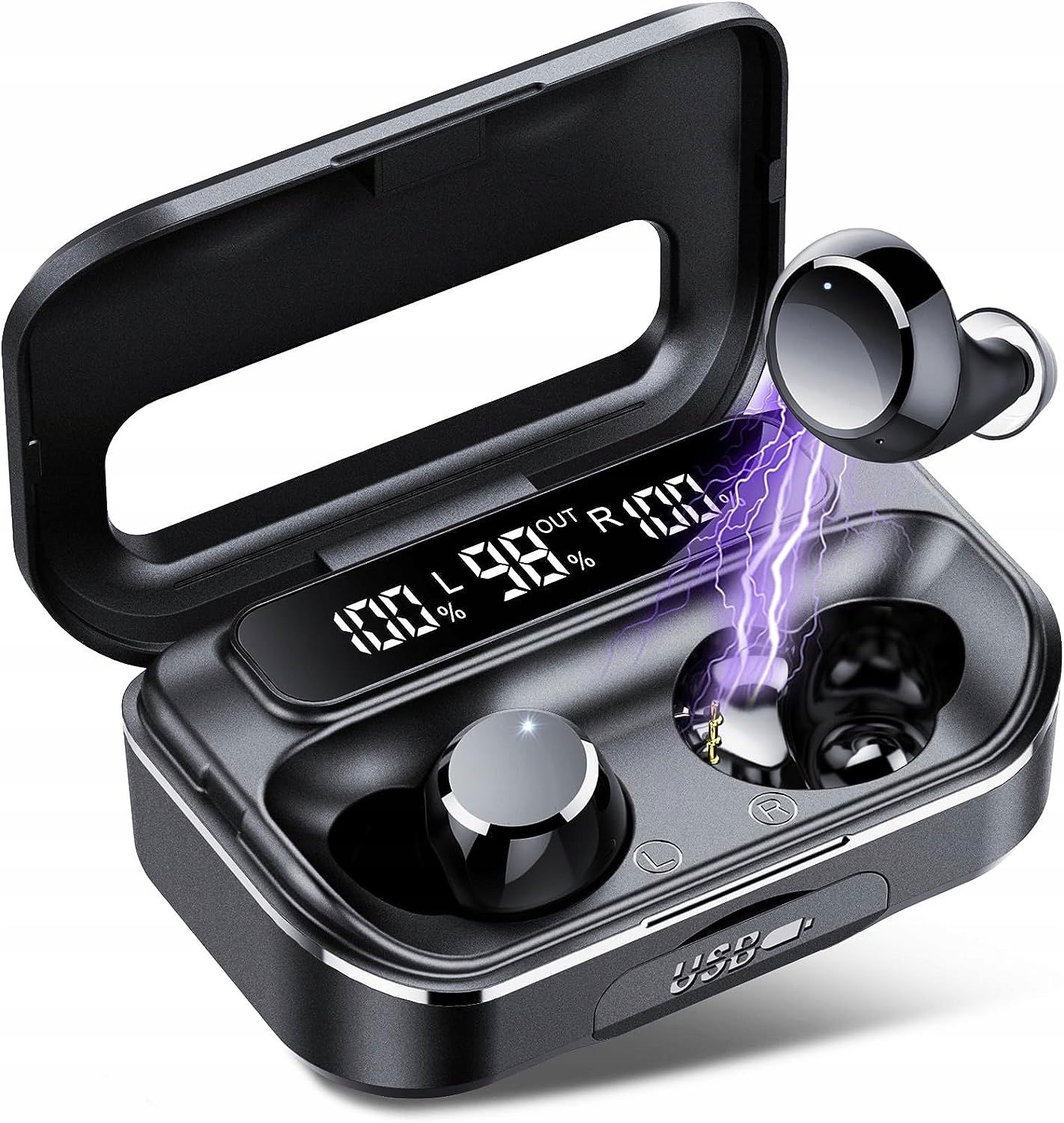 Bezprzewodowe słuchawki douszne są wyposażone w indywidualne wskaźniki LED, aby wyraźnie zobaczyć poziom mocy każdej słuchawki i etui ładującego.