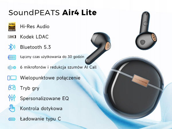 Połączenie Bluetooth 5.3 i Wielopunktowe - Dzięki zaawansowanemu układowi Bluetooth 5.3 słuchawki Air4 Lite z redukcją szumów zapewniają bardziej stabilne połączenie, większą prędkość transmisji i mniejsze zużycie energii. Ciesz się bezproblemową łącznością dzięki obsłudze połączeń wielopunktowych, co pozwala na jednoczesne podłączenie wielu urządzeń. Bez wysiłku przełączaj się między urządzeniami bez konieczności wielokrotnego parowania i rozłączania.