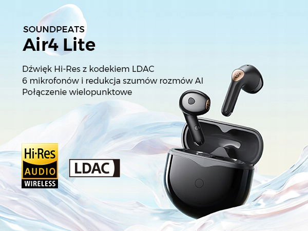 Kodek Hi-Res i LDAC - Bezprzewodowe słuchawki SoundPEATS Air4 Lite są wyposażone w kodek audio LDAC, pozwalający na transmisję z wyższą przepływnością (maksymalnie 990 kb/s) i częstotliwością próbkowania (do 96 kHz), co zapewnia wyjątkowo czysty dźwięk. Dzięki oficjalnemu certyfikatowi Hi-Res Audio, słuchawki Bluetooth Air4 Lite dokładnie przechwytują oryginalne analogowe źródło dźwięku przy minimalnych stratach, umożliwiając użytkownikom pełne zanurzenie się w atmosferze koncertów na żywo dzięki odtwarzaniu skomplikowanych szczegółów w różnych dźwiękach.