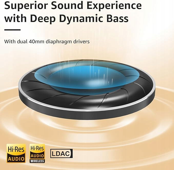 Słuchaj każdego szczegółu: Wyposażone w dwa 40-milimetrowe przetworniki membranowe słuchawki Bluetooth Ankbit LDAC zapewniają doskonały dźwięk z głębokim dynamicznym basem certyfikowanym przez Hi-Res Audio i Hi-Res Audio Wireless.