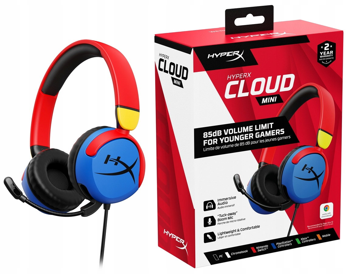 Słuchawki przewodowe gamingowe nauszne HyperX Cloud Mini Multi 7G8F3AAR, wielokolorowe, szeroka kompatybilność audio jack 3.5mm, odpowiednie dla dzieci dzięki ograniczeniu głośności do 85dB