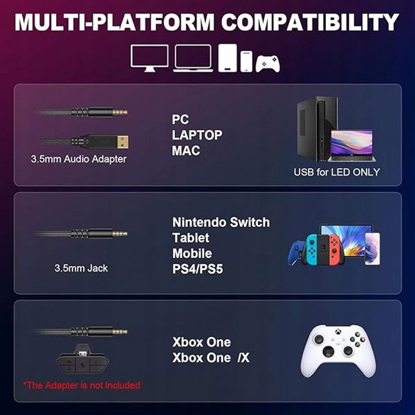 Zestaw słuchawkowy Krysenix z mikrofonem jest kompatybilny z PS4, PS5, Xbox One, Switch, PC, laptopami i większością innych urządzeń z gniazdem audio 3,5 mm.