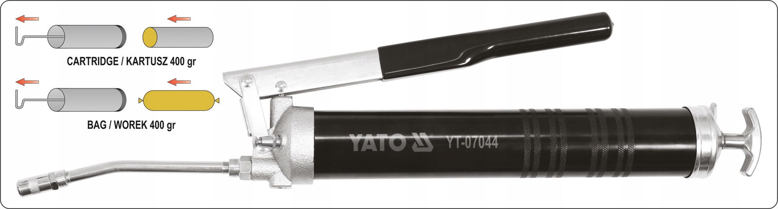 pojemność: 400 gr2 rodzaje ładowania smaru: kartusz i worektłok o napędzie ręcznym z gumowym uszczelnieniem, odpornym na długotrwałe działanie smarów i olejówsystem odpowietrzający przestrzeń pod tłokiemżeliwna głowicastalowy cylinderciśnienie robocze: 31 MPa, maks. 70 MPaw zestawie sztywna końcówka smarująca