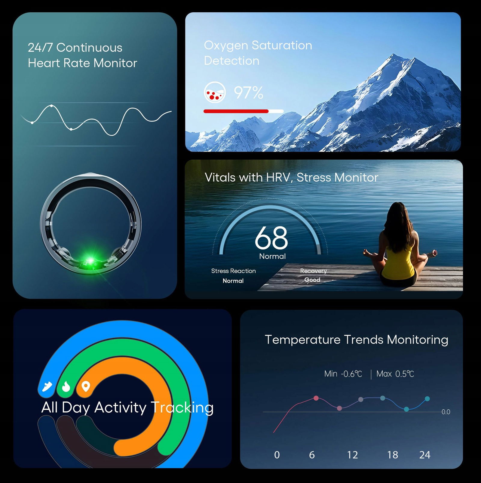Wodoodporność 5ATM (50m): Nie musisz się martwić o kontakt z wodą, pierścień jest odporny na zachlapania, pot i pływanie.