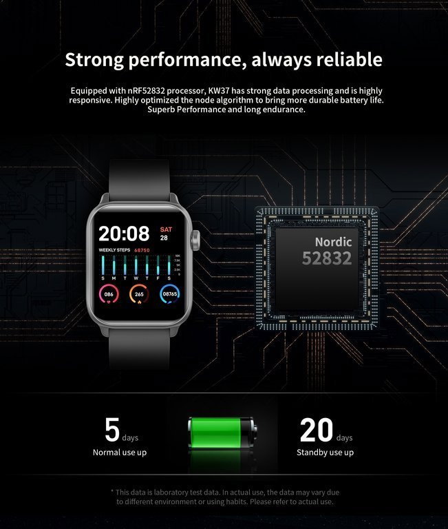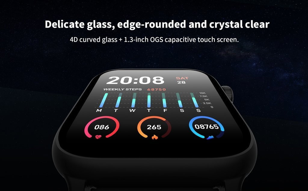 Kompatybilność Android 5.1 i nowszy, iOS 9.0 i nowszy.Wysokiej jakości w pełni dotykowy wyświetlacz cyfrowy 1.3" cala TFT. Rozdzielczość: 240*240 pikseli 64KB RAM + 512KB ROM + SPI rozszerzona 64MB. Funkcje: Energooszczędny Bluetooth Chip wersja 4.0, monitor tętna, ciśnieniomierz, monitor tlenu we krwi, krokomierz, inteligentny monitoring snu, monitor cyklu dobowego, budzik stoper, timer rejestr spalonych kalorii, rejestr przebytego dystansu, 7 trybów treningu do wyboru, sterowanie muzyką, zdalne zdjęcie, tryb nie przeszkadzać, powiadomienia o wiadomościach z telefonu, przypomnienia i inne.Motywy tarczy do wyboru. Procesor nRF52832.Bateria: 160 mAh. Czas pracy 10 dni w trybie czuwania, 5 dni normalny czas pracy.Stopień ochrony przed pyłem i wodą: IP68.Pasek z teleskopem do szybkiej wymiany o szerokości 20mm.