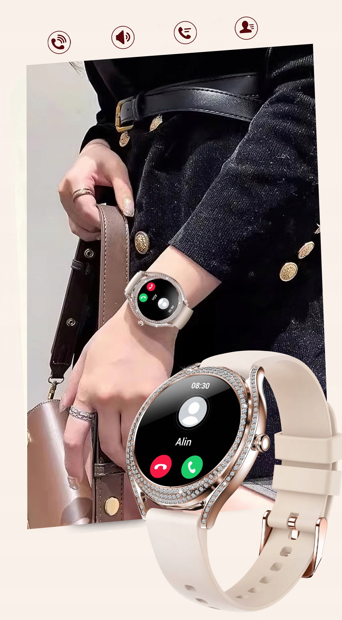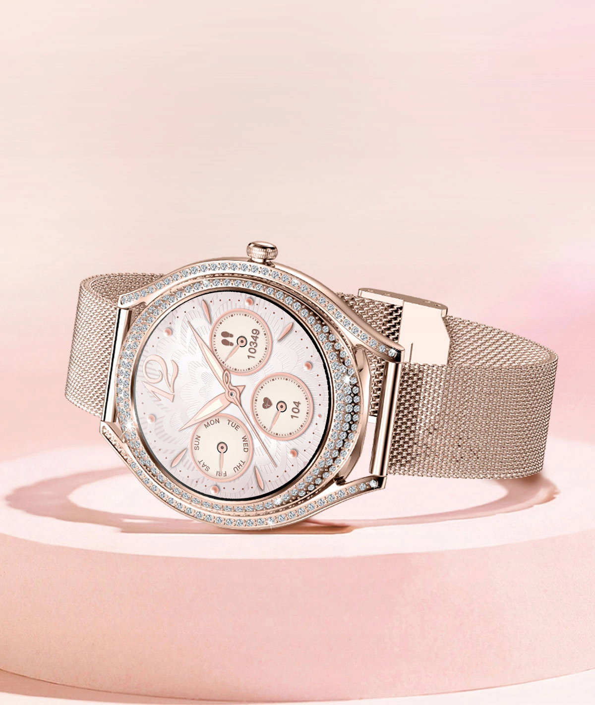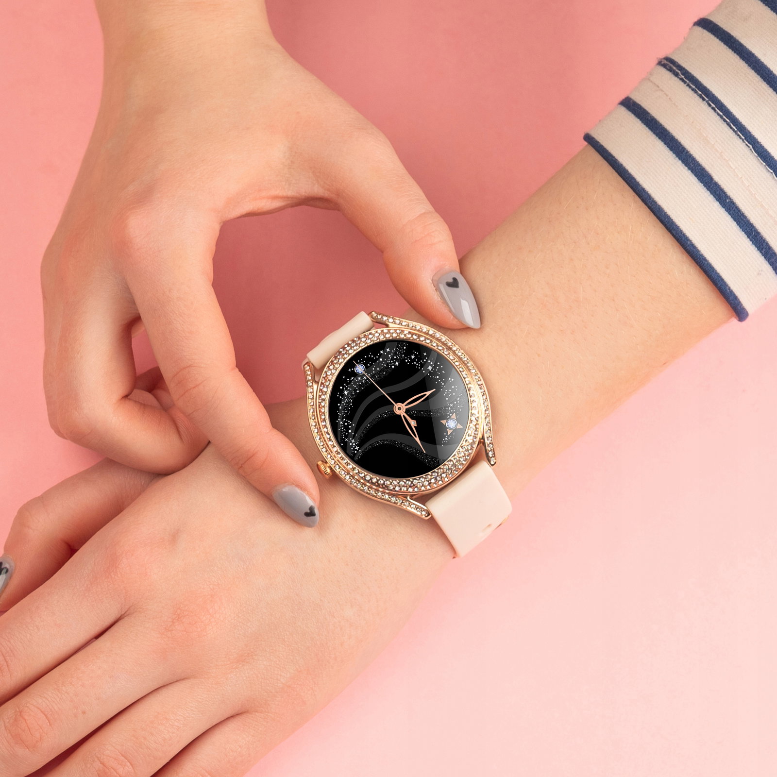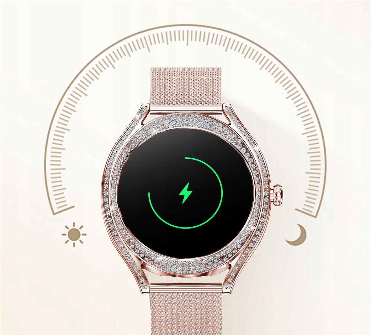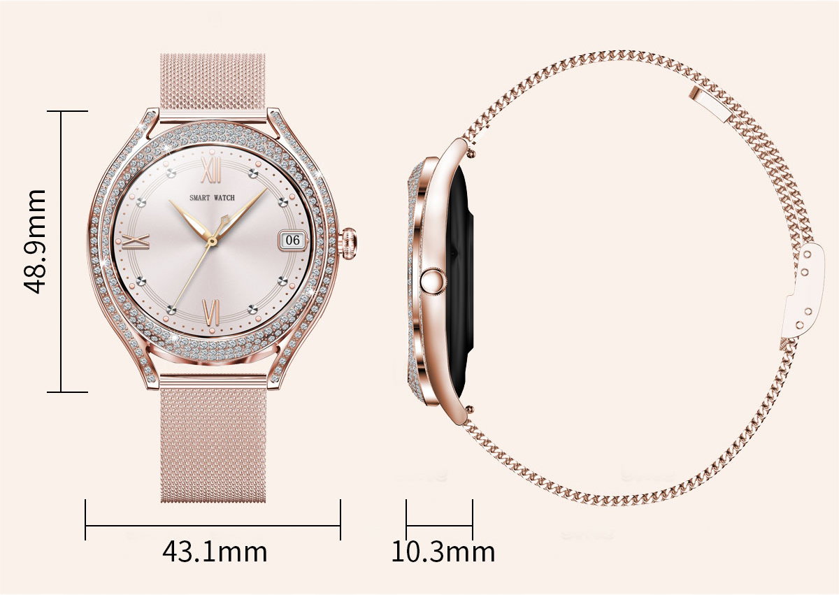 Minimalistyczny i elegancki design ze złotą kopertą ozdobioną cyrkoniami, idealnie komponuje się z wysokiej jakości 1,28-calowym wyświetlaczem AMOLED HD. Ekran zapewnia nie tylko wyjątkową ostrość i czystość obrazu, ale również efektywność energetyczną, co przekłada się na dłuższy czas pracy urządzenia.