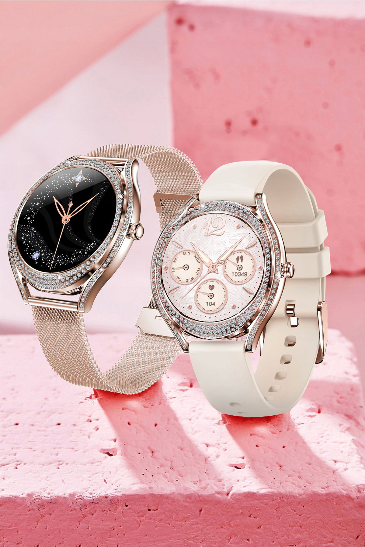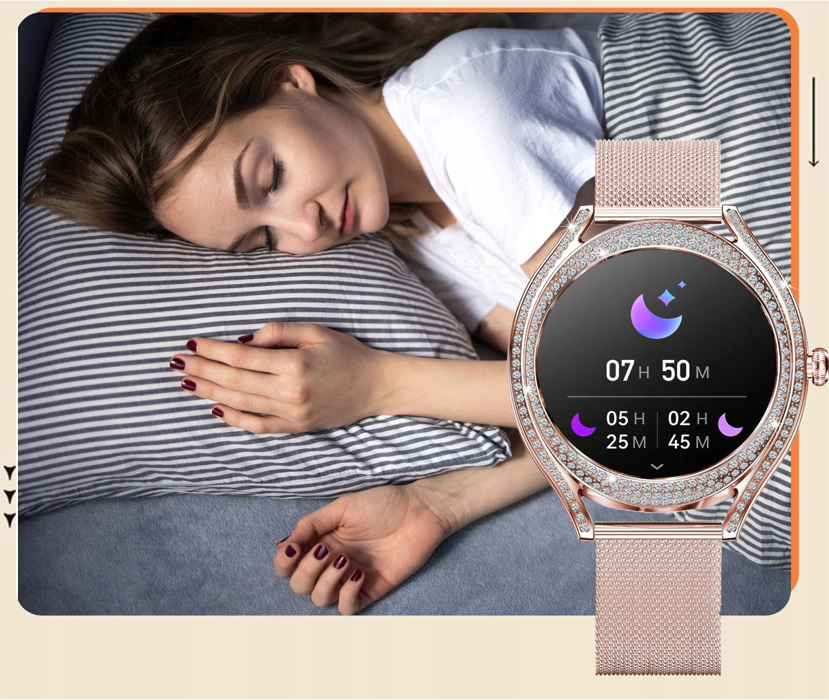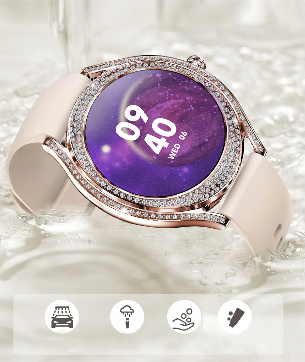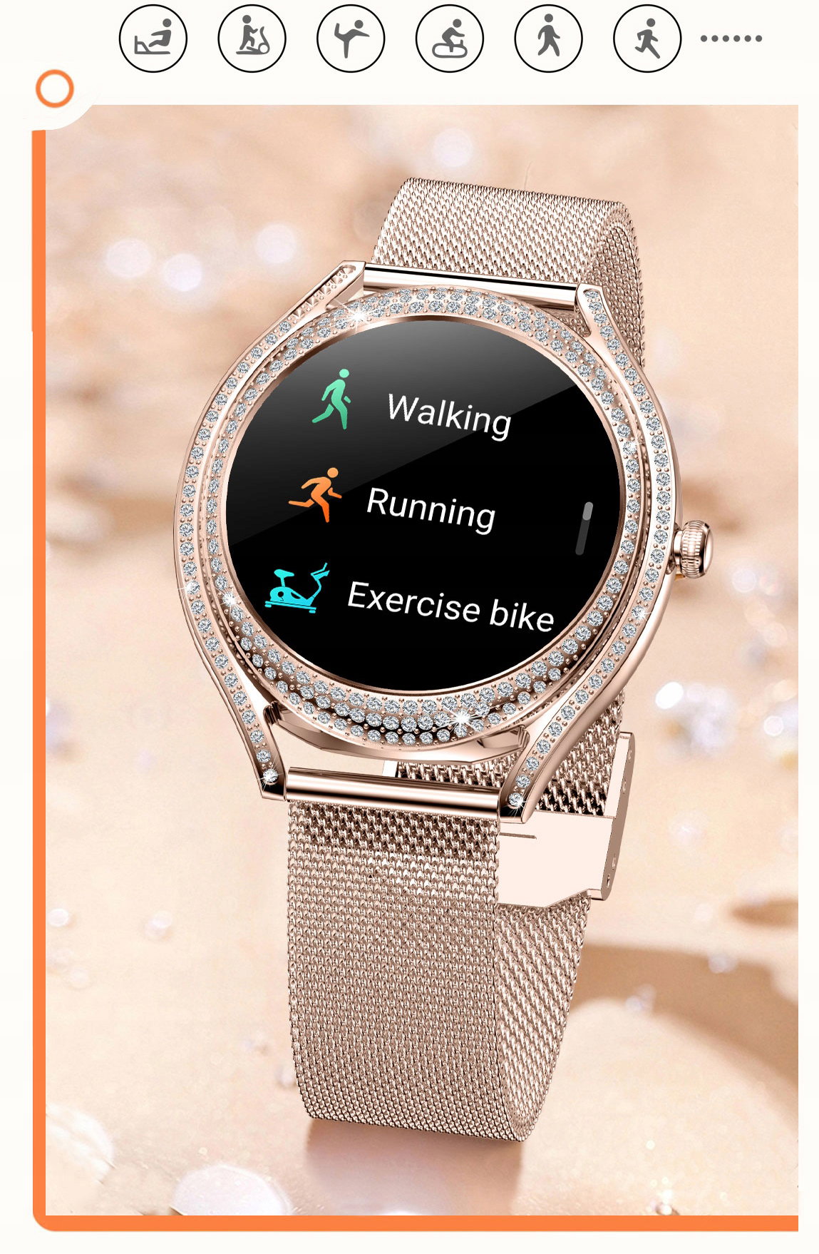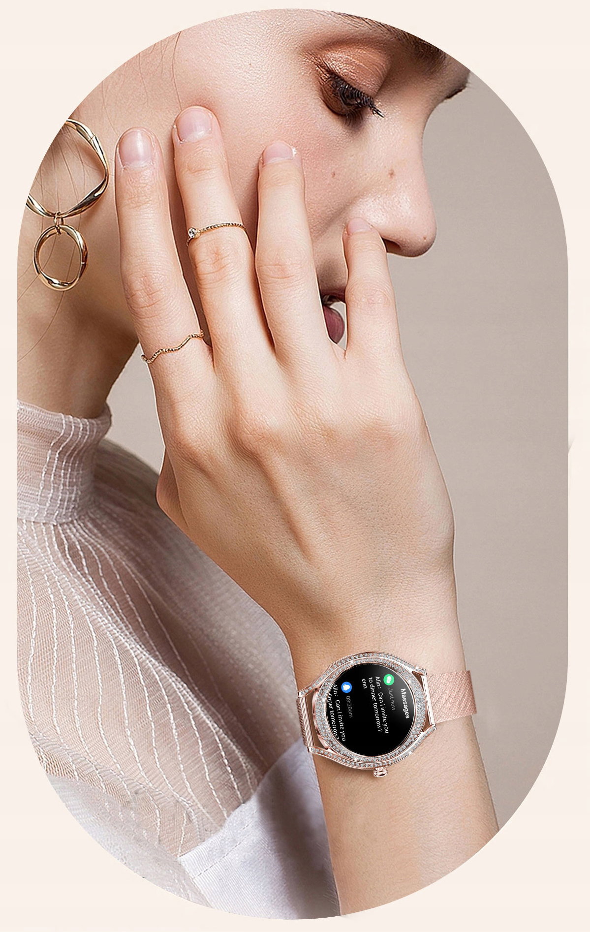 Minimalistyczny i elegancki design ze złotą kopertą ozdobioną cyrkoniami, idealnie komponuje się z wysokiej jakości 1,28-calowym wyświetlaczem AMOLED HD. Ekran zapewnia nie tylko wyjątkową ostrość i czystość obrazu, ale również efektywność energetyczną, co przekłada się na dłuższy czas pracy urządzenia.