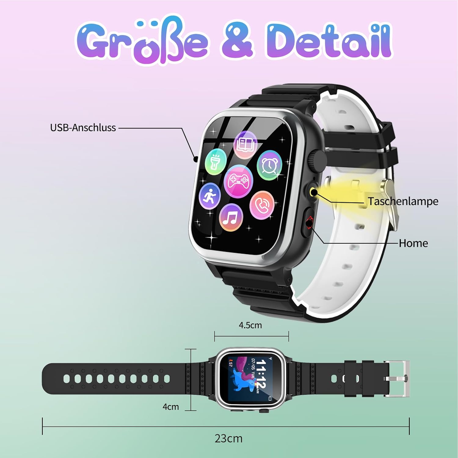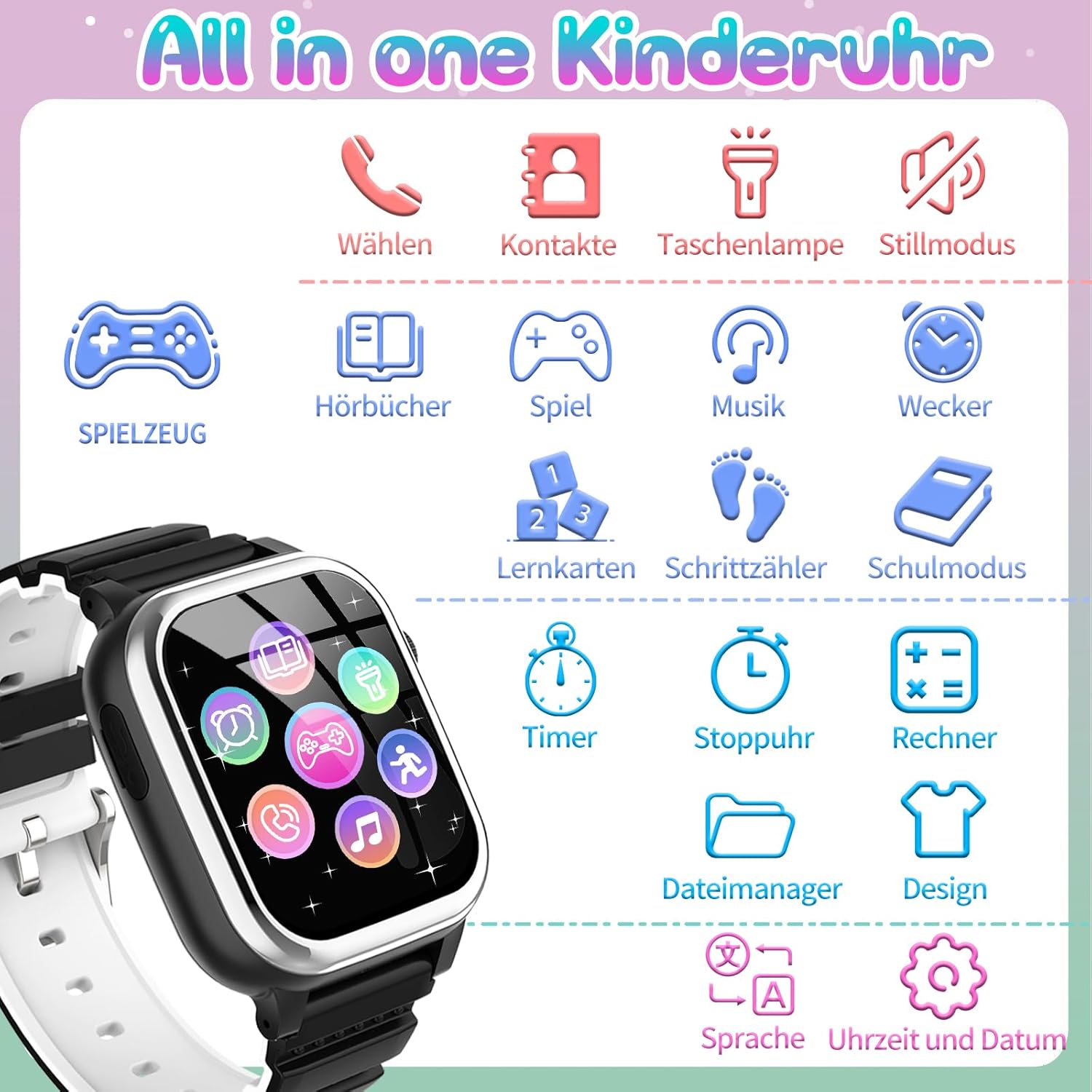 - Wielofunkcyjny zegarek dla dzieci: smartwatch JUBUNRER dla dzieci jest wyposażony we wbudowany, kolorowy ekran dotykowy HD, który chroni oczy dziecka. Oprócz 26 gier, zegarek oferuje również funkcje połączeń, 10 angielskich audiobooków, karty edukacyjne, krokomierz, śledzenie kalorii, SOS, muzykę, stoper, kalkulator, kalendarz, budzik, minutnik, tapetę do samodzielnego montażu, latarkę oraz tryb cichej klasy.