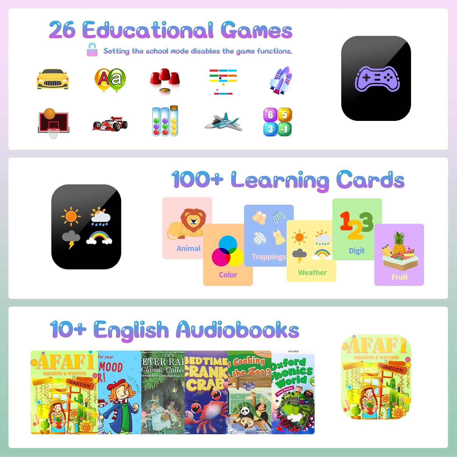 - Fiszki, audiobooki po angielsku, 26 gier i tryb klasowy: Zgodnie z komentarzami rodziców, smartwatch dla dzieci oferuje 2 nowe funkcje edukacyjne: 10 angielskich audiobooków i fiszek, które wspierają naukę i rozwój dzieci. Smartwatch dla dzieci oferuje 26 gier logicznych, rodzice mogą ustawić zakazany czas zabawy w trybie klasowym, a dzieci grają w gry logiczne po szkole, co może skutecznie ćwiczyć logiczne myślenie.