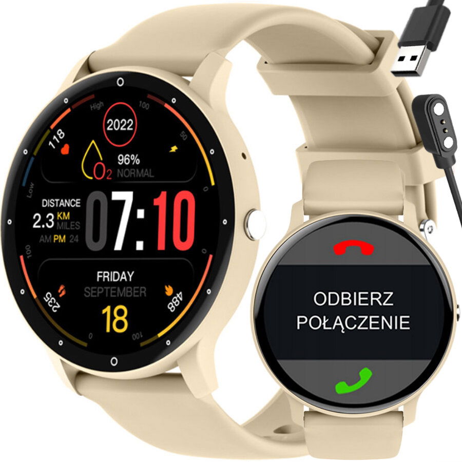 - Funkcje: Datownik, Budzik, Stoper, Powiadomienia SMS, WhatsApp, FB etc., Monitor snu, Sterowanie muzyką, Sterowanie aparatem, Monitor cyklu miesiączkowego, Tryby sportowe, Rejestr dystansu / spalonych kalorii, Znajdź telefon, Przypomnienie o wypiciu wody, Przypomnienie o ruchu, Powiadomienia o połączeniach, Menu w języku polskim, Motywy tarczy do wyboru, Pogoda, Wykonywanie połączeń, Historia połączeń