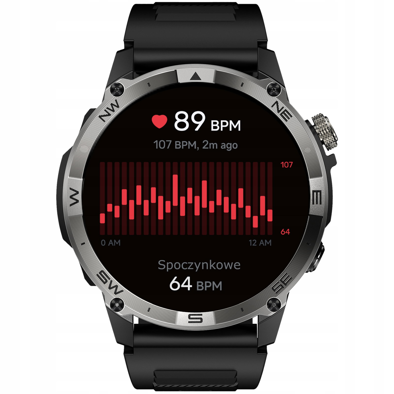 - Pomiar Tętna i Monitorowanie Stanu Zdrowia Smartwatch monitoruje tętno w czasie rzeczywistym, dostosowując się do intensywności wysiłku, co pozwala na pełną kontrolę nad organizmem. Funkcja pomiaru tętna działa całą dobę, co pozwala ocenić także regenerację organizmu po intensywnym wysiłku.