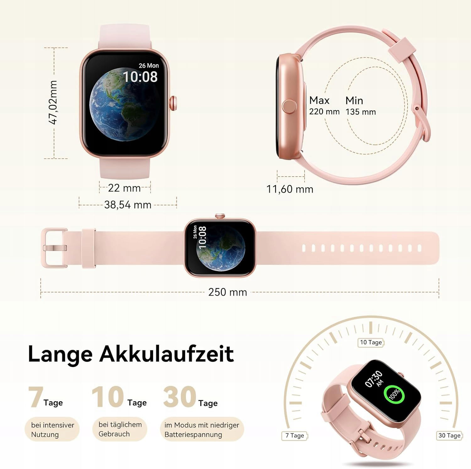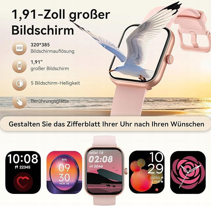 Doskonały wyświetlacz i funkcjonalność: inteligentna bransoletka dla kobiet ma doskonały 1,91-calowy ekran dotykowy HD. Za pomocą pokrętła po prawej stronie możesz szybko przewijać menu. Możesz wybierać spośród ponad 100 tarcz lub dodawać ulubione zdjęcia do zegarka cyfrowego, dzięki czemu możesz łatwo dostosować swój tracker aktywności. Twój styl należy do Ciebie.