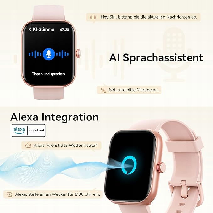 Wbudowany asystent głosowy Alexa i AI. Zegarek damski oferuje podwójny inteligentny dostęp, wbudowany asystent głosowy Alexa i AI. Możesz sterować urządzeniami gospodarstwa domowego z obsługą Alexy (głośniki, światła, inteligentne wtyczki itp.), a także sprawdzać pogodę i ustawiać alarmy. Smartwatch może również natychmiast uzyskać dostęp do wielu funkcji, aktywując asystenta głosowego telefonu komórkowego (Siri, Google, Asystent).
