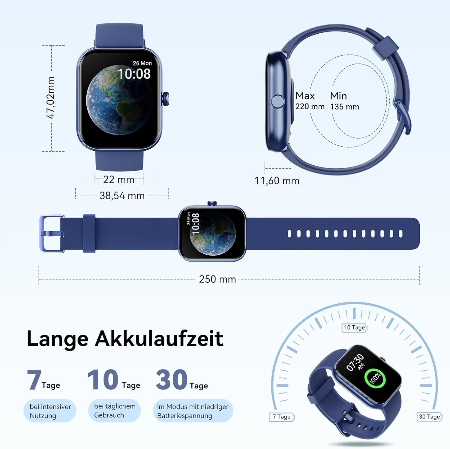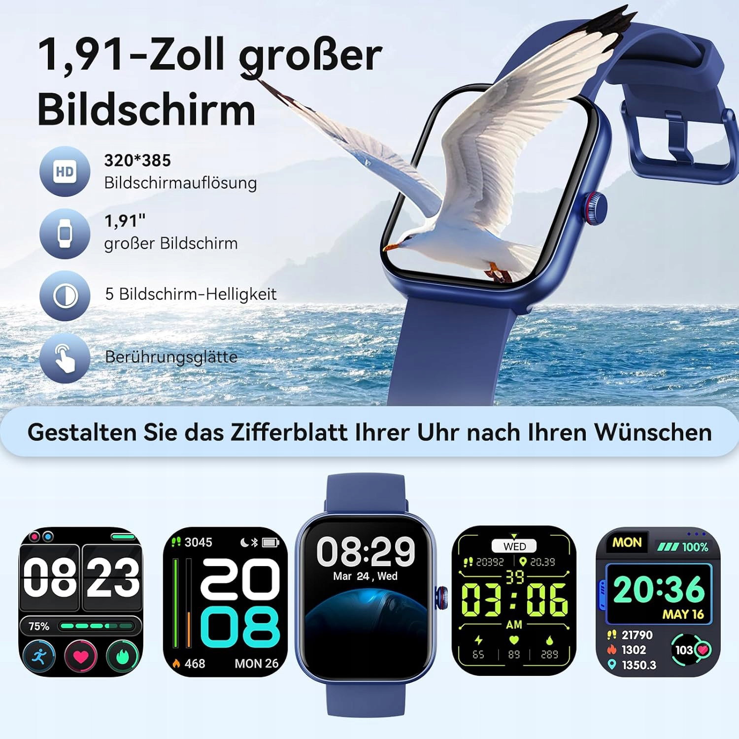 Doskonały wyświetlacz i funkcjonalność: inteligentna bransoletka dla kobiet ma doskonały 1,91-calowy ekran dotykowy HD. Za pomocą pokrętła po prawej stronie możesz szybko przewijać menu. Możesz wybierać spośród ponad 100 tarcz lub dodawać ulubione zdjęcia do zegarka cyfrowego, dzięki czemu możesz łatwo dostosować swój tracker aktywności. Twój styl należy do Ciebie.