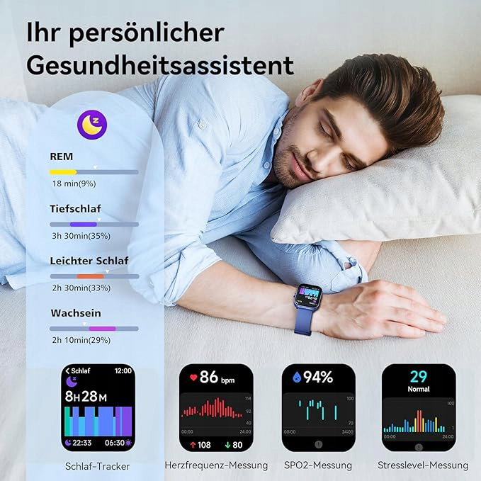 PEŁNY MONITORING ZDROWIA Zegarek damski śledzi tętno, SpO2 i poziom stresu oraz ostrzega, gdy dane dotyczące zdrowia są poza zasięgiem. Zaawansowana funkcja monitorowania snu zapewnia szczegółowe raporty dotyczące snu i sugestie, aby poprawić regenerację. Dzięki tym kompleksowym funkcjom zdrowotnym w smartwatchu możesz łatwo monitorować swoje samopoczucie.