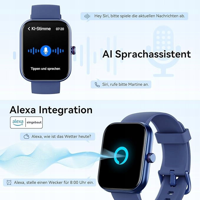 Wbudowany asystent głosowy Alexa i AI. Zegarek damski oferuje podwójny inteligentny dostęp, wbudowany asystent głosowy Alexa i AI. Możesz sterować urządzeniami gospodarstwa domowego z obsługą Alexy (głośniki, światła, inteligentne wtyczki itp.), a także sprawdzać pogodę i ustawiać alarmy. Smartwatch może również natychmiast uzyskać dostęp do wielu funkcji, aktywując asystenta głosowego telefonu komórkowego (Siri, Google, Asystent).