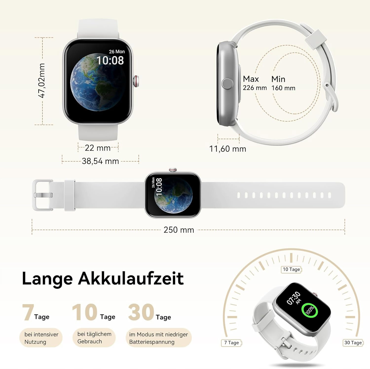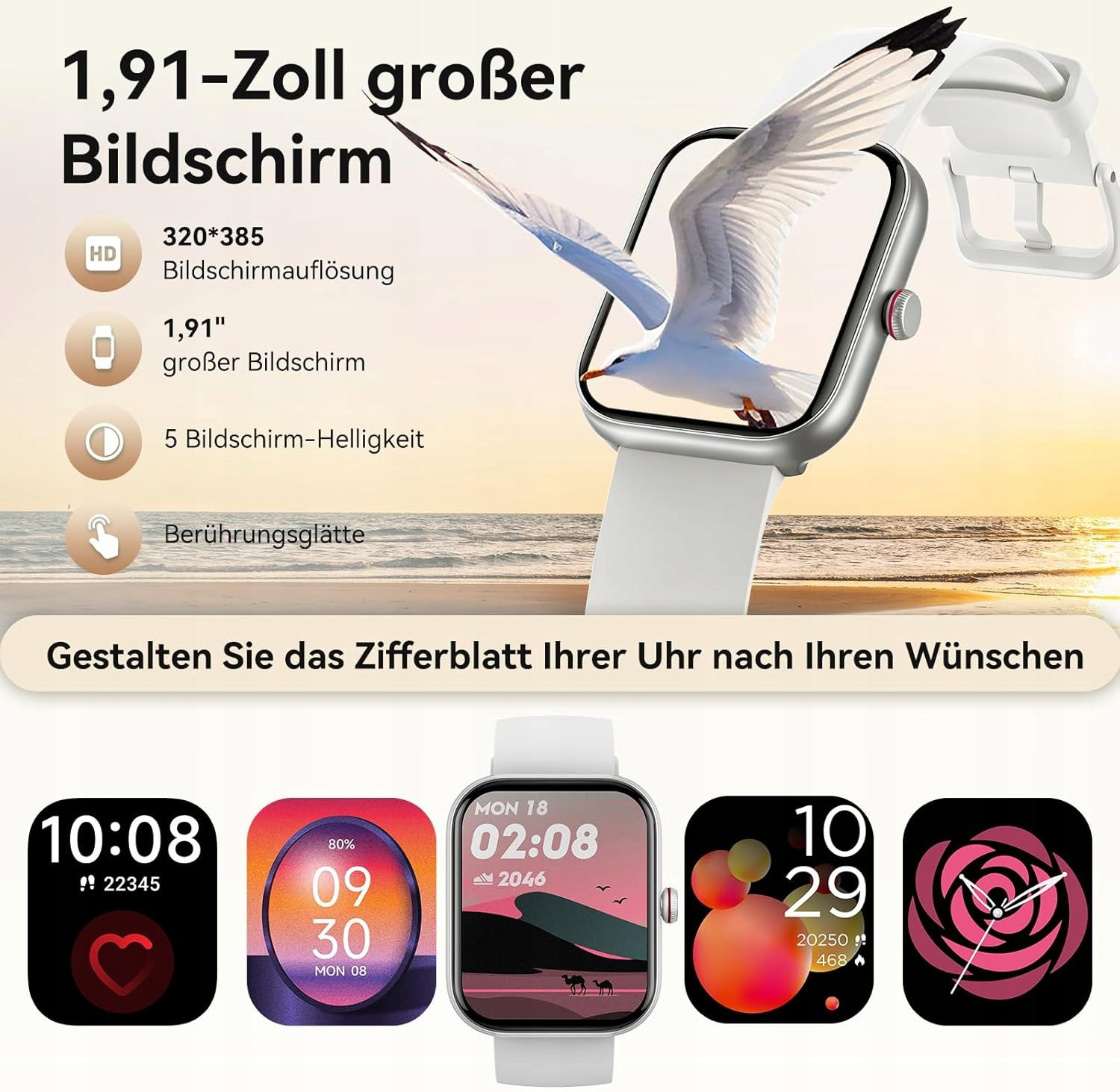 Doskonały wyświetlacz i funkcjonalność: inteligentna bransoletka dla kobiet ma doskonały 1,91-calowy ekran dotykowy HD. Za pomocą pokrętła po prawej stronie możesz szybko przewijać menu. Możesz wybierać spośród ponad 100 tarcz lub dodawać ulubione zdjęcia do zegarka cyfrowego, dzięki czemu możesz łatwo dostosować swój tracker aktywności. Twój styl należy do Ciebie.