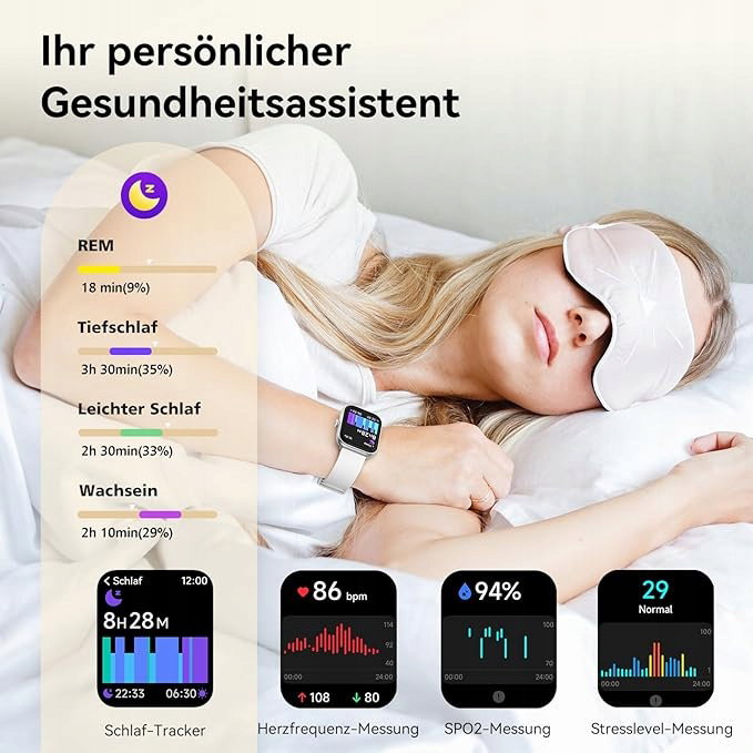 PEŁNY MONITORING ZDROWIA Zegarek damski śledzi tętno, SpO2 i poziom stresu oraz ostrzega, gdy dane dotyczące zdrowia są poza zasięgiem. Zaawansowana funkcja monitorowania snu zapewnia szczegółowe raporty dotyczące snu i sugestie, aby poprawić regenerację. Dzięki tym kompleksowym funkcjom zdrowotnym w smartwatchu możesz łatwo monitorować swoje samopoczucie.
