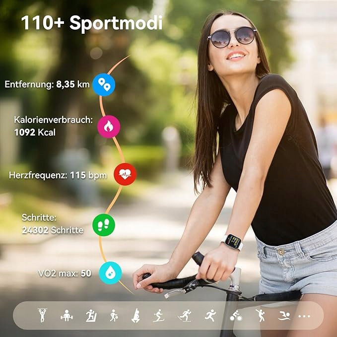 Ponad 100 funkcji fitness Wodoodporny zegarek sportowy IP68 ma 100 trybów sportowych, takie aktywności jak bieganie i chodzenie mogą być wykrywane automatycznie. Możesz również ustawić codzienne cele treningowe, dokładnie śledząc liczbę kroków i kalorii podczas ćwiczeń na zegarku fitness dla kobiet, aby jak najszybciej uzyskać sylwetkę swoich marzeń.
