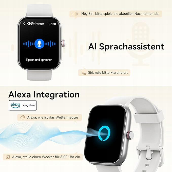 Wbudowany asystent głosowy Alexa i AI. Zegarek damski oferuje podwójny inteligentny dostęp, wbudowany asystent głosowy Alexa i AI. Możesz sterować urządzeniami gospodarstwa domowego z obsługą Alexy (głośniki, światła, inteligentne wtyczki itp.), a także sprawdzać pogodę i ustawiać alarmy. Smartwatch może również natychmiast uzyskać dostęp do wielu funkcji, aktywując asystenta głosowego telefonu komórkowego (Siri, Google, Asystent).