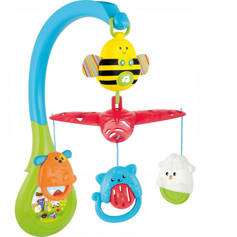 Karuzela to jedna z pierwszych zabawek niemowlaka. Zabawka pomaga dziecku zasnąć.Zabawka 3 W 1 to : Karuzelka, Grająca Pszczółka i 3 grzechotki. Obraca się, gra 12 melodii. Odtwarza muzykę aż 8 minut. Grającą pszczółkę oraz grzechotki można łatwo odłączyć i bawić się nimi w wózku lub łóżeczku. Grzechotki są łatwe do trzymania, każda grzechotka kryje inną funkcję:• pszczółka gra melodyjki,• owieczka jest gryzakiem,• kotek ma obracającą się kulkę,• piesek grzechocze• Wyraziste barwy zabawki i figurki zwierząt ułatwiają dziecku naukę rozróżniania kolorów i kształtów. Ruszające się zabawki aktywizują dziecko. Wodzenie oczami wzmacnia mięśnie oczu. Wesołe dźwięki kształtują muzykalność dziecka. Grzechotki odłączone od karuzeli stymulują też zmysł dotyku oraz ćwiczą sprawność małych paluszków.