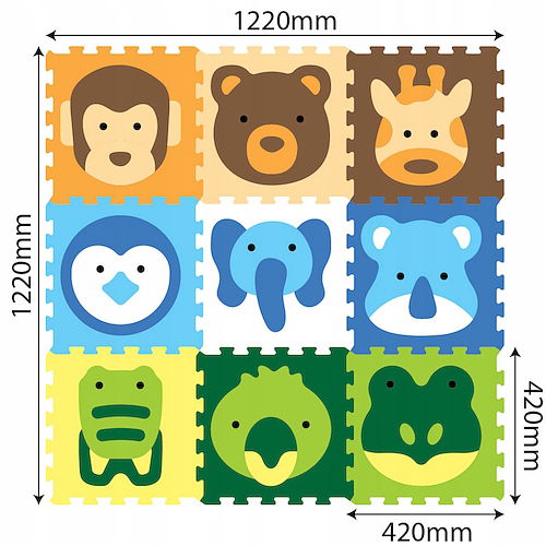 Układanka ze zwierzakami może być używana jako mata oraz jako puzzle do układania. Jest zrobiona z miękkiej pianki, przyjaznej w dotyku. Może też posłużyć jako podkładka przy innych zabawach czy drzemce.Zabawka uczy: spostrzegawczości, rozpoznawania kolorów i kształtów, budowania figur przestrzennych, zabawy z wyobraźnią. Pomysły jak można bawić się puzzlami: połącz z dzieckiem wszystkie elementy i opowiedz, co się na nich znajduje.Zbuduj z puzzli figury przestrzenne, np. kostkę lub pudełko i wymyślcie wspólnie, jak można się nimi bawić. Zrób z nich stolik.Jest wiele możliwości zabawy, ogranicza was jedynie wasza wyobraźnia. Układajcie razem piankowe obrazki.Puzzle w puzzlach! Każdy z kwadratowych puzzli ma w sobie wyjmowane zwierzaki składające się z kilku elementów.Maluszek może je wyjmować, by następnie próbować dopasować kształty do odpowiednich otworów. Zabawa ta idealnie rozwinie zdolność myślenia logiczno-przestrzennego.Możecie także budować piankowe konstrukcje, sześciany, wieże, czy piramidy. Puzzle są bardzo miękkie i przyjemne w dotyku. Jedna ze stron posiada interesującą wzorzystą powierzchnię, druga jest zaś gładka.Zalety:• wykonane z miłej w dotyku miękkiej i bezpiecznej pianki• spełniają standardy bezpieczeństwa CE, EN 71• łatwe w czyszczeniu – wystarczy przetrzeć wilgotną ściereczką Wymiary produktu : 32 x 32 x 6,3 cmBezpieczeństwo: EN71-1, EN71-2, ENT1-3• Grubość jednego puzzla: 1,0 cm• Wymiary jednego puzzla: 42 x 42 cm• Powierzchnia maty: 122 x 122 cm• Jeden komplet to 9 dużych puzzli razem z wyjmowanymi kształtami: 50 elementów• Spód: gładki• Wzór: ZwierzakiWiek: +10m