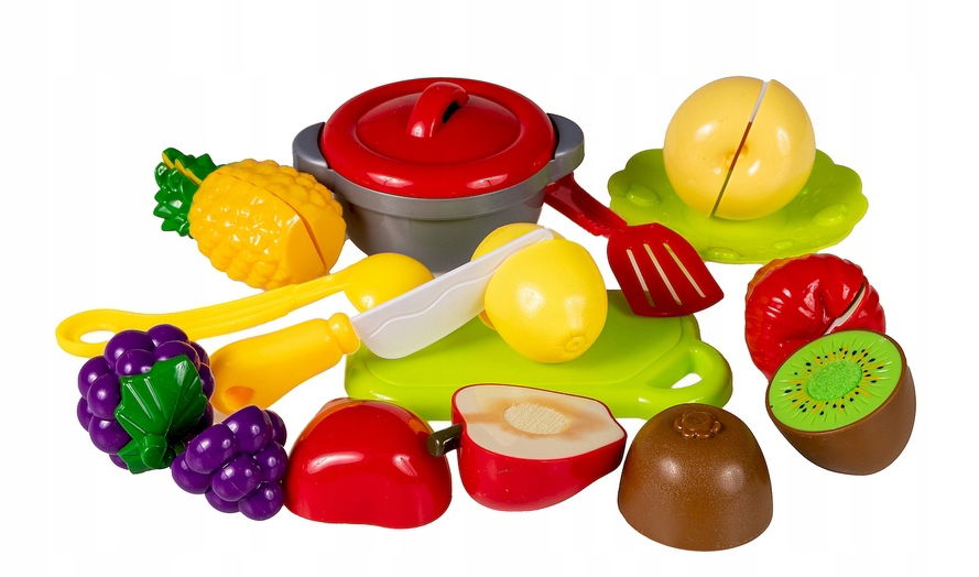 Duży zestaw 12 owoców i warzyw, deski, nożyka oraz dużej tacy. Idealne do zabawy w restaurację, gotowanie, dom. Każdy z owoców/warzyw można „przekroić” – składają się z dwóch połówek, trzymanych razem za pomocą umieszczonego w środku rzepu. W dowolnym momencie rozdziel lub łącz je z powrotem. W środku owoców znajdują się drobne koraliki, dzięki czemu zabawki delikatnie grzechoczą podczas zabawy.