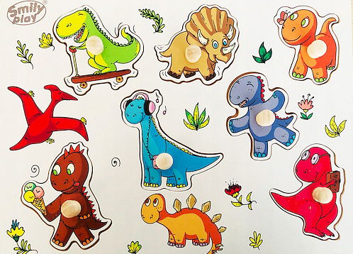 Zestaw składa się z planszy z otworami, do których należy dopasować 7 elementów układanki przedstawiające kilka uroczych Dinozaurów. Elementy zabawki są wykonane z wytrzymałego drewna klejonego warstwowo.
