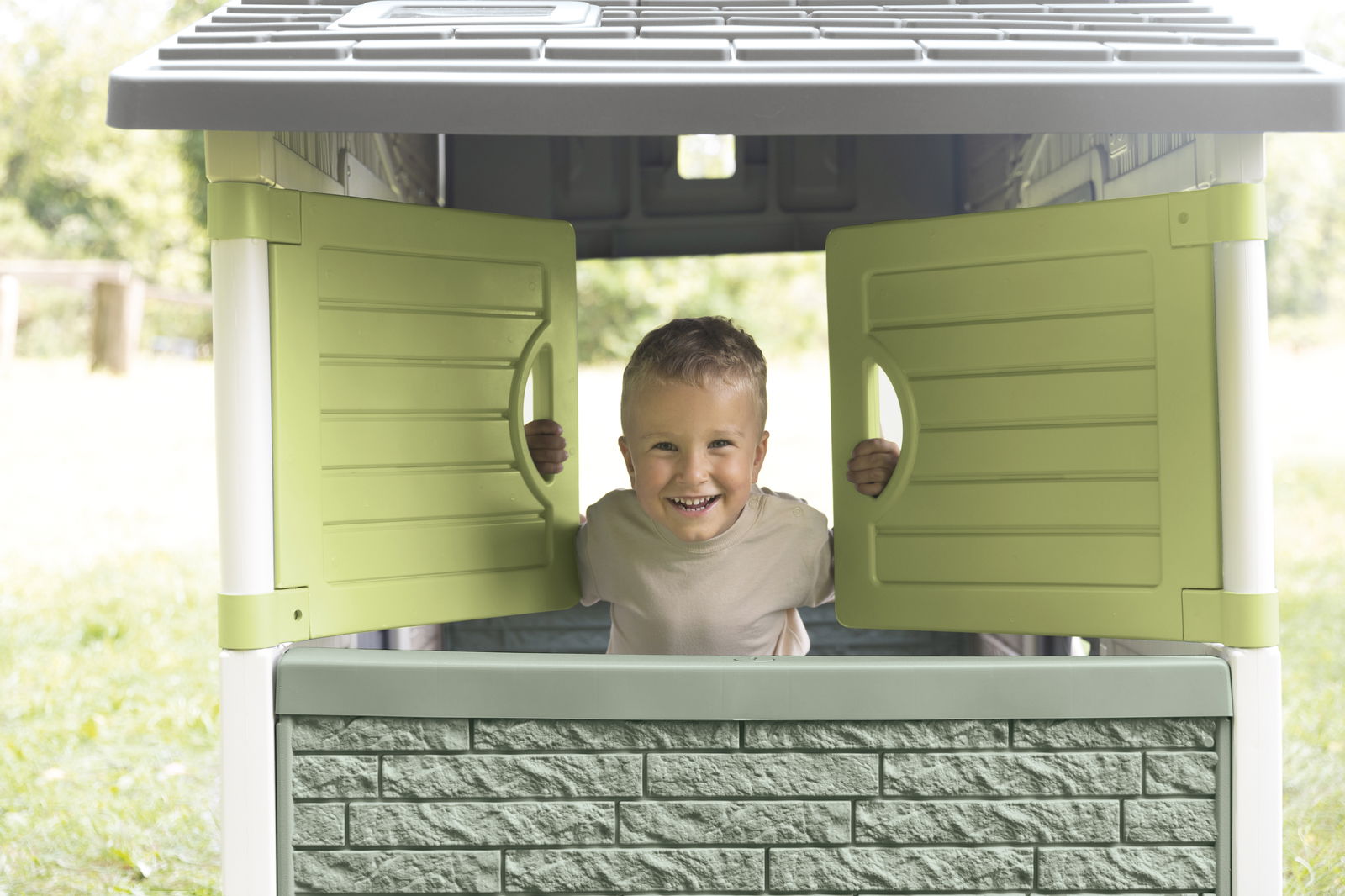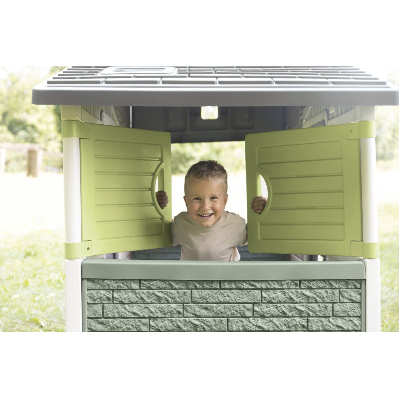 - - Wysoka jakość materiału: Domek wykonany z trwałego tworzywa sztucznego imitującego drewno i kamień, które jest odporne na warunki atmosferyczne, a jednocześnie pochodzi z recyklingu (61% materiału).