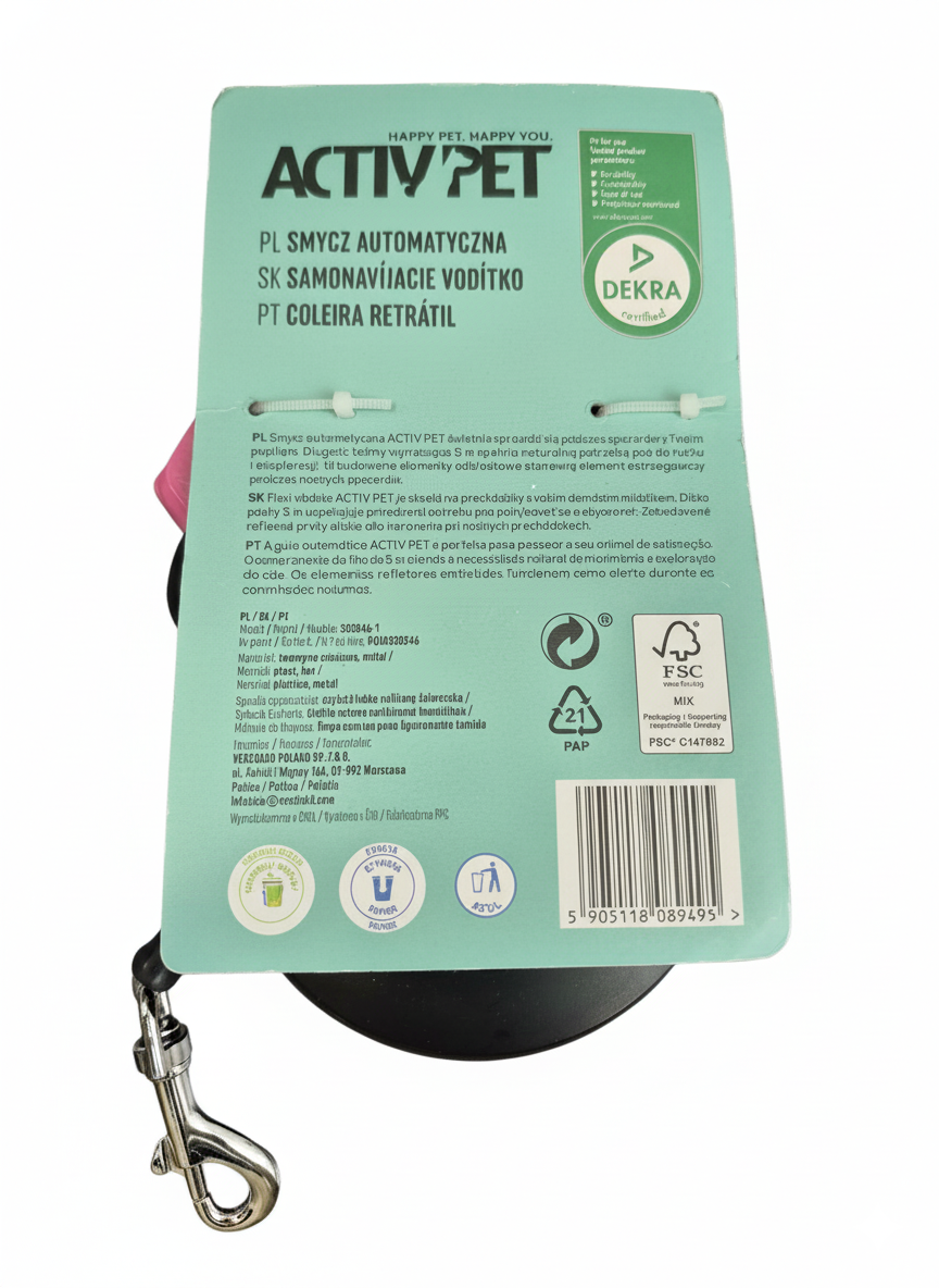 ACTIV PET Smucz Automatyczna Retraktivna – Komfort i Bezpieczeństwo dla Twojego Pupila! Zapewnij swojemu psu maksymalną swobodę i bezpieczeństwo podczas każdego spaceru dzięki smyczy automatycznej ACTIV PET! To innowacyjne rozwiązanie, które łączy w sobie funkcjonalność, wygodę i stylowy design, idealnie dopasowując się do potrzeb zarówno zwierzęcia, jak i właściciela. Główne cechy produktu: Dopasowana do Ciebie: Nasza smycz jest odpowiednia dla małych i średnich psów oraz kotów, zapewniając im komfort i bezpieczeństwo. Wysokiej Jakości Materiały: Wykonana z trwałego tworzywa sztucznego i metalu, smycz jest odporna na uszkodzenia i intensywne użytkowanie. Bezpieczeństwo Po Zmroku: Wbudowane elementy odblaskowe (na kołowrotku) zwiększają widoczność Twojego pupila po zmroku, co przekłada się na większe bezpieczeństwo podczas wieczornych spacerów. Ergonomiczny Uchwyt: Antypoślizgowy uchwyt zapewnia pewne trzymanie i komfort użytkowania, nawet podczas długich spacerów. Łatwa Obsługa: Intuicyjny przycisk blokady umożliwia szybkie i łatwe kontrolowanie długości smyczy, dostosowując ją do aktualnych potrzeb i sytuacji. Certyfikat DEKRA: Gwarancja najwyższej jakości i bezpieczeństwa, potwierdzona niezależnym certyfikatem. Przyjazna dla Środowiska: Produkt posiada certyfikat FSC, co oznacza, że opakowanie pochodzi z odpowiedzialnych źródeł. Specyfikacja: Model/Modelo: 2300546 Kolor: Czarno-różowy z elementami turkusowymi Materiał: Tworzywo sztuczne, metal Długość linki: 5m Opakowanie: Kartonowe (FSC Mix) Wskazówki pielęgnacyjne: Aby smycz służyła Ci jak najdłużej, czyść ją wilgotną ściereczką lub miękką szczotką. Elementy odblaskowe można czyścić delikatnym mydłem. Nie używaj agresywnych środków chemicznych. Zaufaj ACTIV PET i ciesz się bezpiecznymi i komfortowymi spacerami każdego dnia!