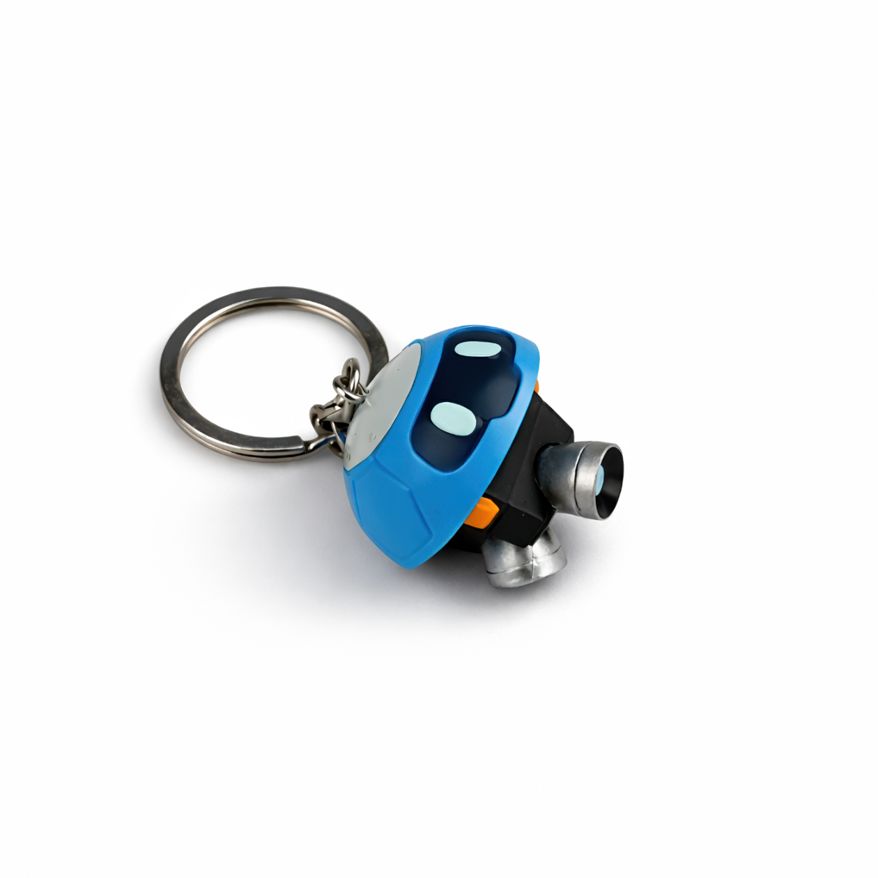 W mroźnych historiach Overwatcha Snowball to mały dron, który potrafi zamienić samotną placówkę w bezpieczną przystań — dowód, że spryt i dobre serce potrafią wygrać każdą misję. Ten brelok Snowball wnosi ten sam ciepły, bohaterski klimat do Twojego codziennego „ekwipunku” jako wyrazisty dodatek o długości 10 cm, idealny do kluczy, plecaka albo smyczy na konwent. Wykonany z żywicy, ma przyjemnie solidny ciężar i ostre detale: jasnoniebieską kopułę, błyszczący ciemny wizjer oraz dwa jasnoniebieskie „oczka”, które od razu kojarzą się fanom z tym uroczym pomocnikiem. Pomarańczowe akcenty po bokach świetnie kontrastują z matową czernią korpusu, a metalicznie srebrne „dyszki”/stopki i przedni wylot nadają mu kompaktowy, gotowy-do-akcji wygląd rodem z gry. Na górze jest srebrna płytka z drobnymi imitacjami śrubek, a solidne metalowe oczko i klasyczne kółko trzymają wszystko pewnie na miejscu. Oznaczenia na opakowaniu wskazują, że to licencjonowany produkt Blizzard od J!NX — przypnij i niech od razu dołączy do Twojej drużyny.