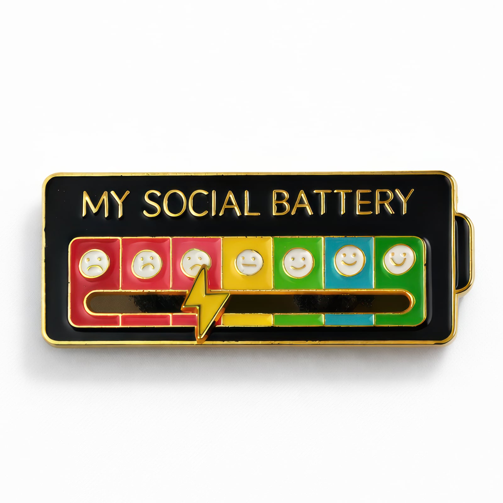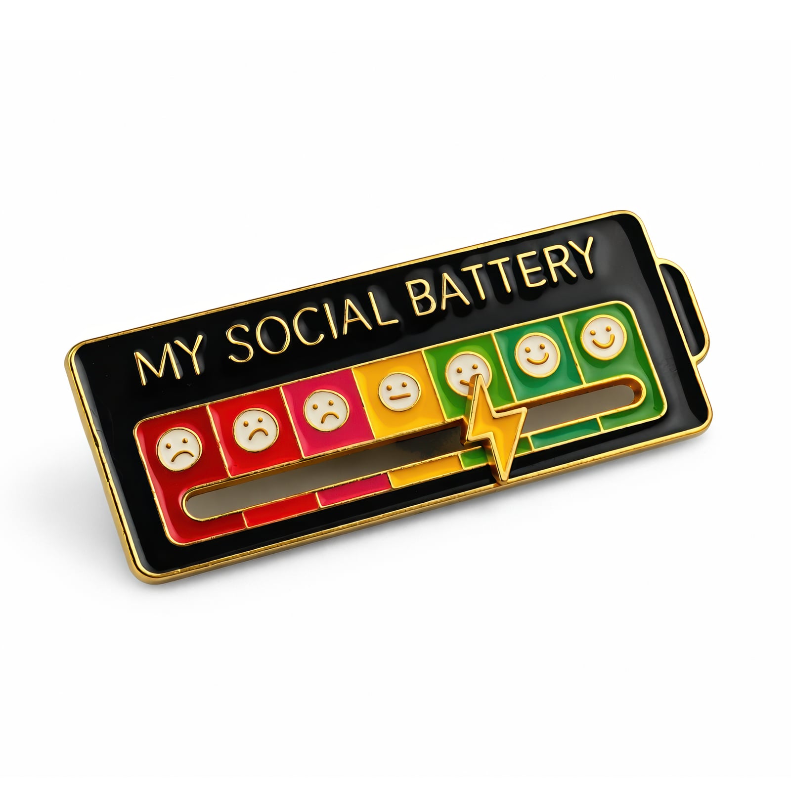 Wykonana z wytrzymałego mosiądzu i wykończona w ciepłym złotym odcieniu, ta emaliowana przypinka ma około 3 cm i przedstawia prostokątną ikonę baterii z zaokrąglonymi rogami. Błyszcząca czarna ramka otacza żywą listwę baterii podzieloną na spektrum kolorów – od głębokiej czerwieni na dole do jasnej żółci na górze – a każdy segment jest tłoczony uśmiechniętą twarzą, od smutnej po promieniejącą. Uderzający złoty błyskawica łukuje się nad listwą, sugerując szybkie doładowanie. Tył przypinki charakteryzuje się subtelną plecioną teksturą, a solidne metalowe mocowanie utrzymuje ją pewnie na każdej kurtce lub torbie. Idealna dla każdego, kto zna rytm energii społecznej, ta ozdoba zamienia powszechne wyrażenie w zabawną deklarację.