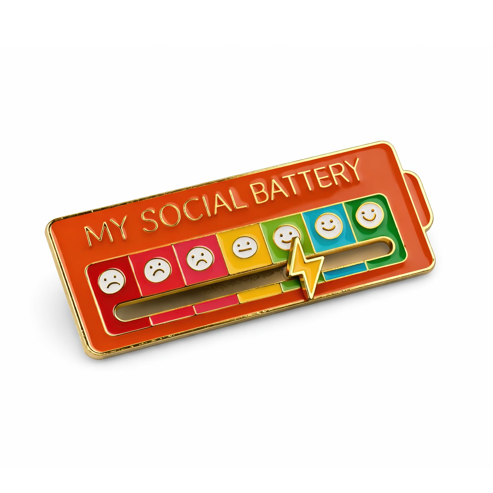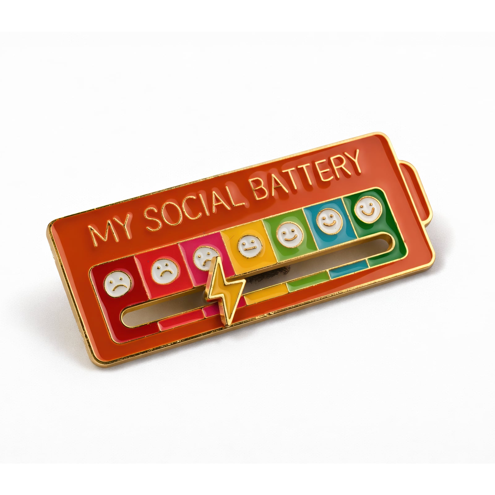Metalowy pin o długości 4 cm, w kształcie ikony baterii, z zaokrąglonym prostokątem świecącym ciepłym, terakotowym kolorem. Poziomy pasek jest podzielony na segmenty, z których każdy zawiera inną emotikonę twarzy – smutną, neutralną, wesołą – ukazując spektrum energii społecznej. Złoty wskaźnik błyskawicy wypełnia pasek między neutralną a wesołą twarzą, pozwalając na szybkie sprawdzenie poziomu "naładowania". Powyżej baterii wygrawerowano słowa “MOJA ENERGIA SPOŁECZNA” złotą czcionką. Metal jest ciężki, polerowany, z subtelnym, teksturowanym wykończeniem, które daje solidne uczucie w dotyku. Na odwrocie znajduje się klasyczne zapięcie oraz wzorzysta faktura ułatwiająca przymocowanie. Idealny dla każdego, kto chce podzielić się znajomym uczuciem rozładowania społecznego lub pełnego naładowania.