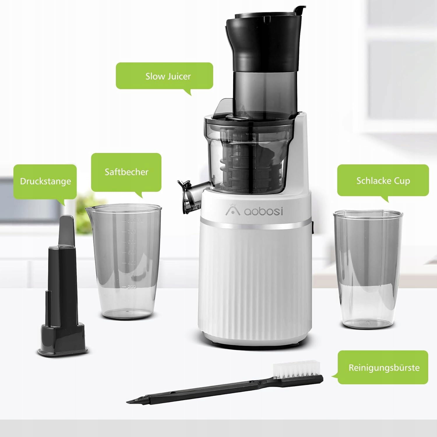 Aobosi Slow Juicer do całych owoców i warzyw i bez BPA, elektryczna wyciskarka do soków z otworem 80 mm, zwycięzca testu warzyw i owoców, funkcja wsteczna, cichy silnik, biała