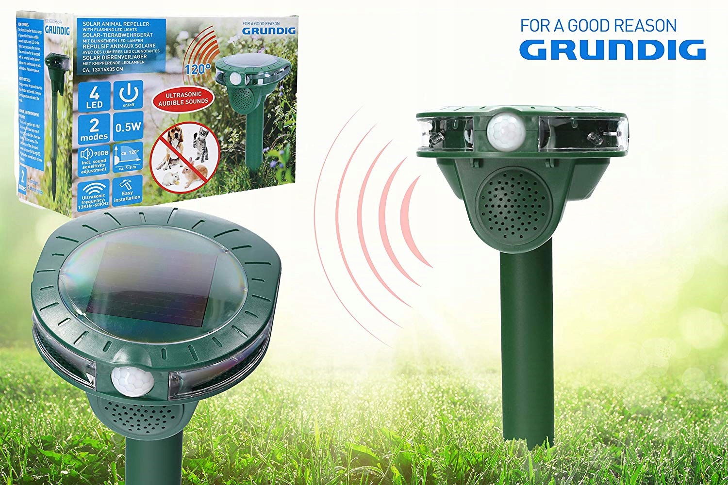 Ultradźwiękowy odstraszacz zwierząt GRUNDIG z 4 błyskającymi diodami LED