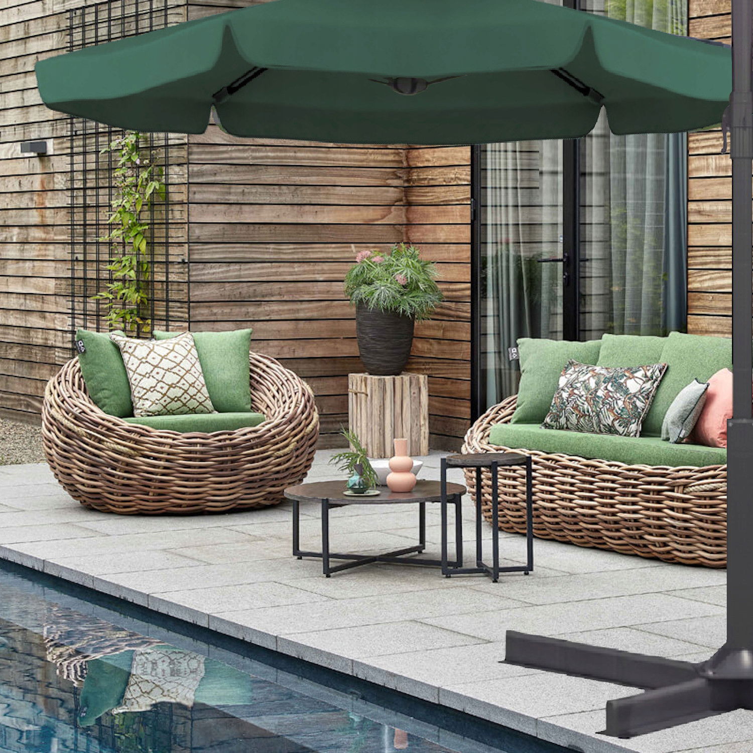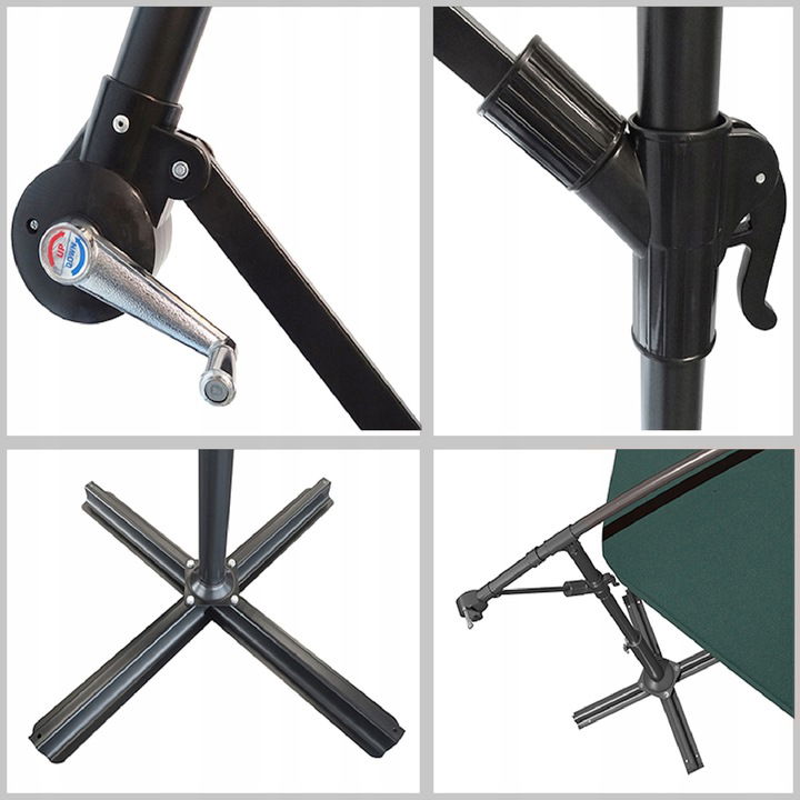 - Łatwość obsługi: System korbowy umożliwia wygodne składanie i rozkładanie parasola, a regulacja wysokości i kąta nachylenia zapewnia komfortowe dopasowanie.