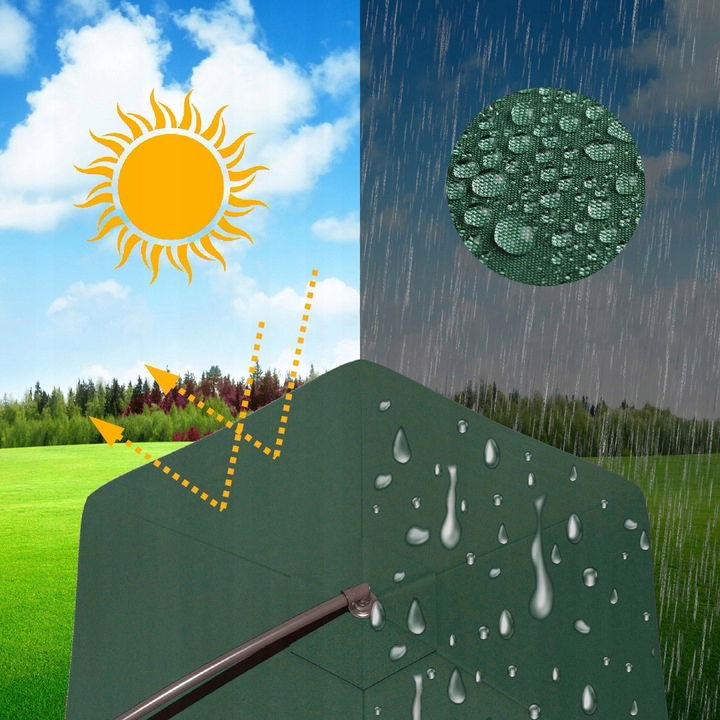 - Ochrona przed słońcem i deszczem: Dzięki wodoodpornemu materiałowi oraz dużej średnicy czaszy, parasol skutecznie chroni przed promieniowaniem słonecznym i lekkim deszczem.