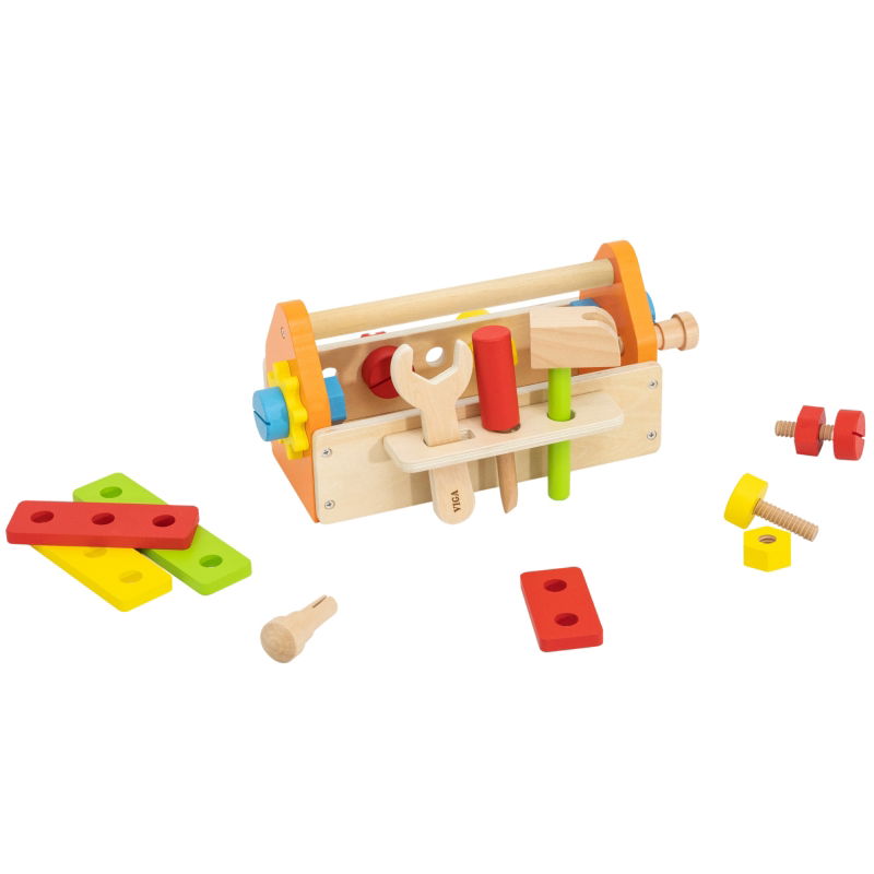 Odkryj pasję majsterkowania z tym kompletem narzędzi dla małych rzemieślników! Skrzynka drewniana zawiera młotek, klucz, śrubokręt, 4 pary śrub i nakrętek, kołek, 2 koła zębate oraz 2 panele z otworami. Dzięki temu dzieci mogą doskonalić swoje umiejętności obracania, uderzania i dopasowywania, rozwijając zdolności manualne. Zabawa w majsterkowanie wspiera kreatywność, ciekawość i wyobraźnię dziecka. Całość wykonana jest z drewna, pomalowana bezpiecznymi farbami i pozbawiona ostrych krawędzi, zapewniając bezpieczną zabawę. Produkt jest dedykowany dla dzieci powyżej 3 roku życia. Pozwól swojemu dziecku odkryć świat majsterkowania i rozwijać swoje zdolności już dziś!
