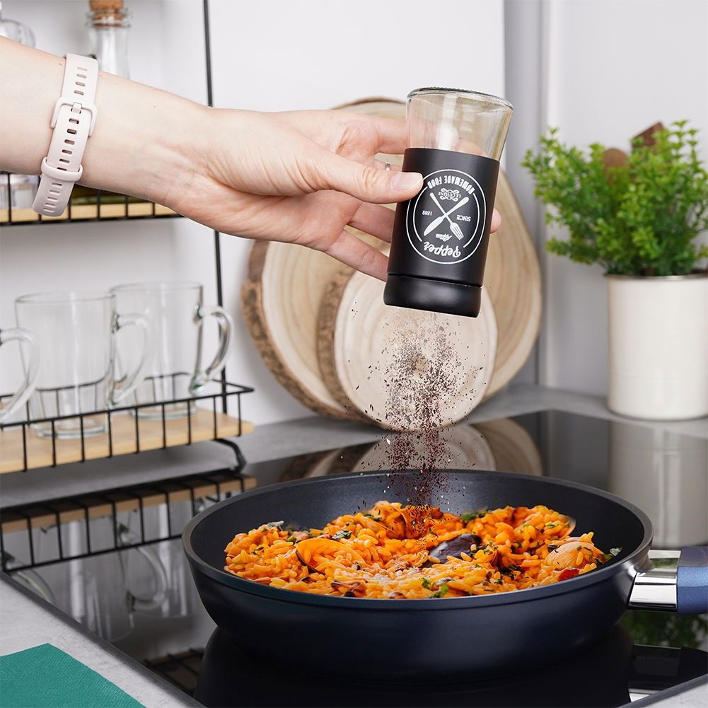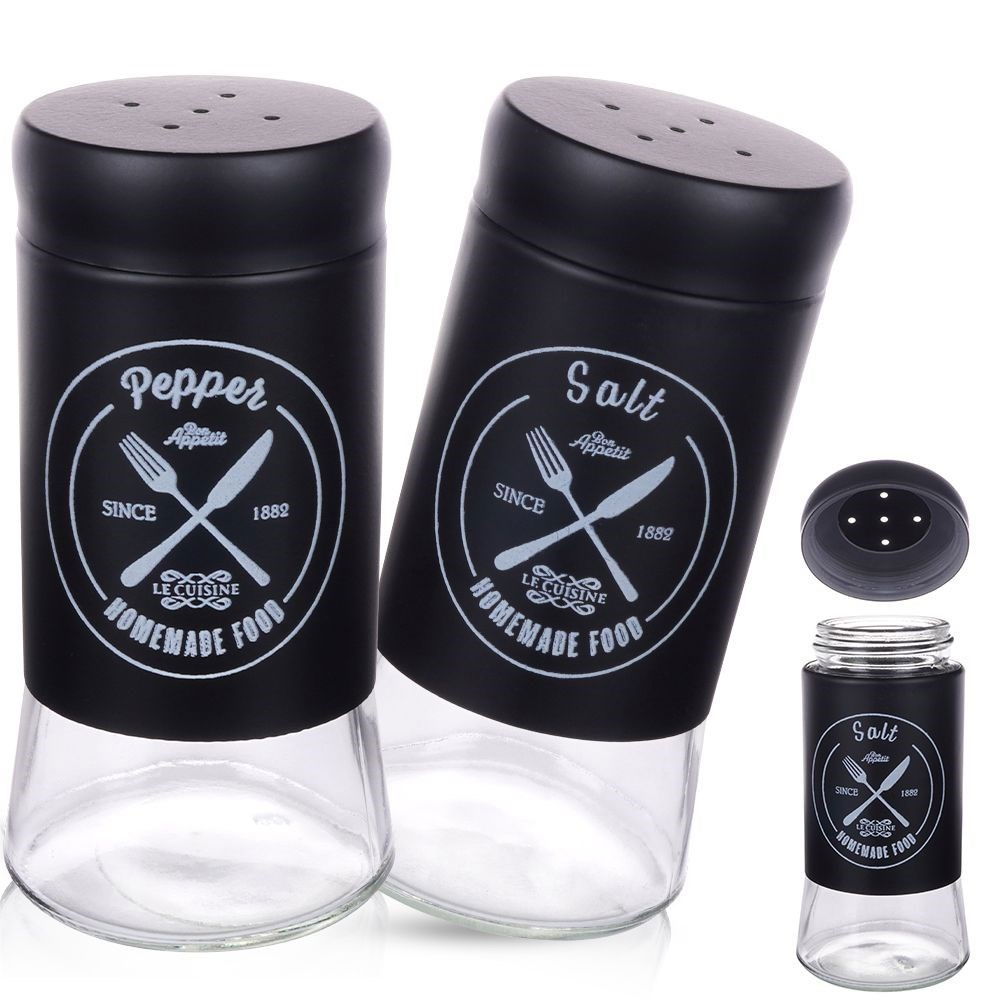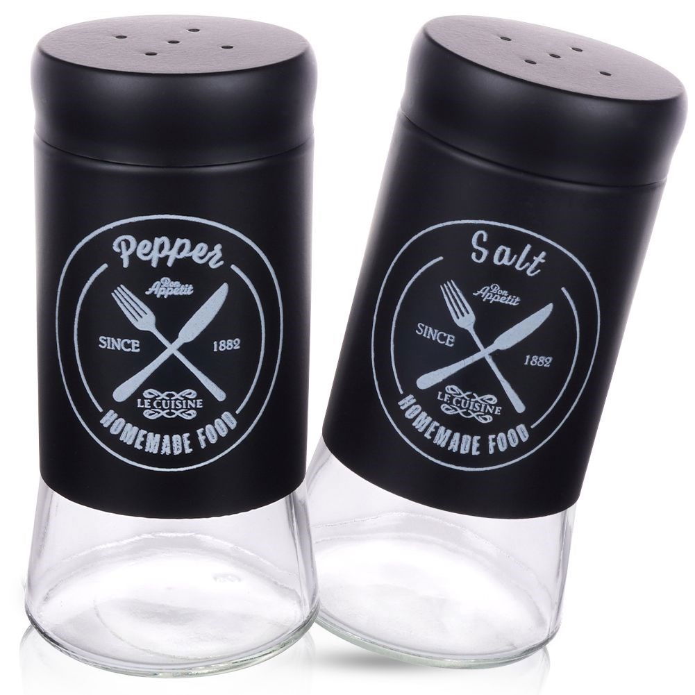 PRAKTYCZNE - Zestaw przyprawników składający się z solniczki oraz pieprzniczki. Wymiary każdego pojemnika wynoszą: 5,5 x 5,5 x 11 cm. SOLIDNE - Wykonane z wysokiej jakości szkła oraz metalu w modnym, czarnym kolorze. Białe nadruki precyzyjnie określają przeznaczenie, ułatwiając odróżnienie soli od pieprzu. ŁATWE DOZOWANIE - Przyprawniki wyposażone są w praktyczne zakrętki z dziurkami. Otwory pozwolą dawkować odpowiednią ilość przypraw bez ryzyka dodania zbyt dużej ilości. PRZYDATNE - Sprawdzą się do przechowywania, podawania oraz dozowania przypraw. Dzięki nim podstawowe ulubione przyprawy będą zawsze pod ręką. Przezroczyste szkło w dolnej części i napisy pozwolą bez problemu rozpoznać umieszczone w środku przyprawy. Zestaw przydatny zarówno w użytku domowym, jak i w gastronomii. EFEKTOWNE - Solniczka i pieprzniczka prezentują się bardzo efektownie. Będzie stanowić piękną dekorację stołu oraz kuchni. Zestaw dwóch pojemników składający się z solniczki i pieprzniczki. Wykonane z wytrzymałych materiałów. Wygodne dozowanie zapewnią otwory, które pozwolą uniknąć dodania zbyt dużej ilości przypraw. Łatwe w czyszczeniu i użytkowaniu. Dozowanie przypraw z pojemnika jest dużo wygodniejsze niż bezpośrednio z torebki. Przyprawniki mają elegancki wygląd i będą pięknie prezentować się na stole, idealnie komponując się z każdą zastawą. Wyprodukowano zgodnie z europejskimi standardami.