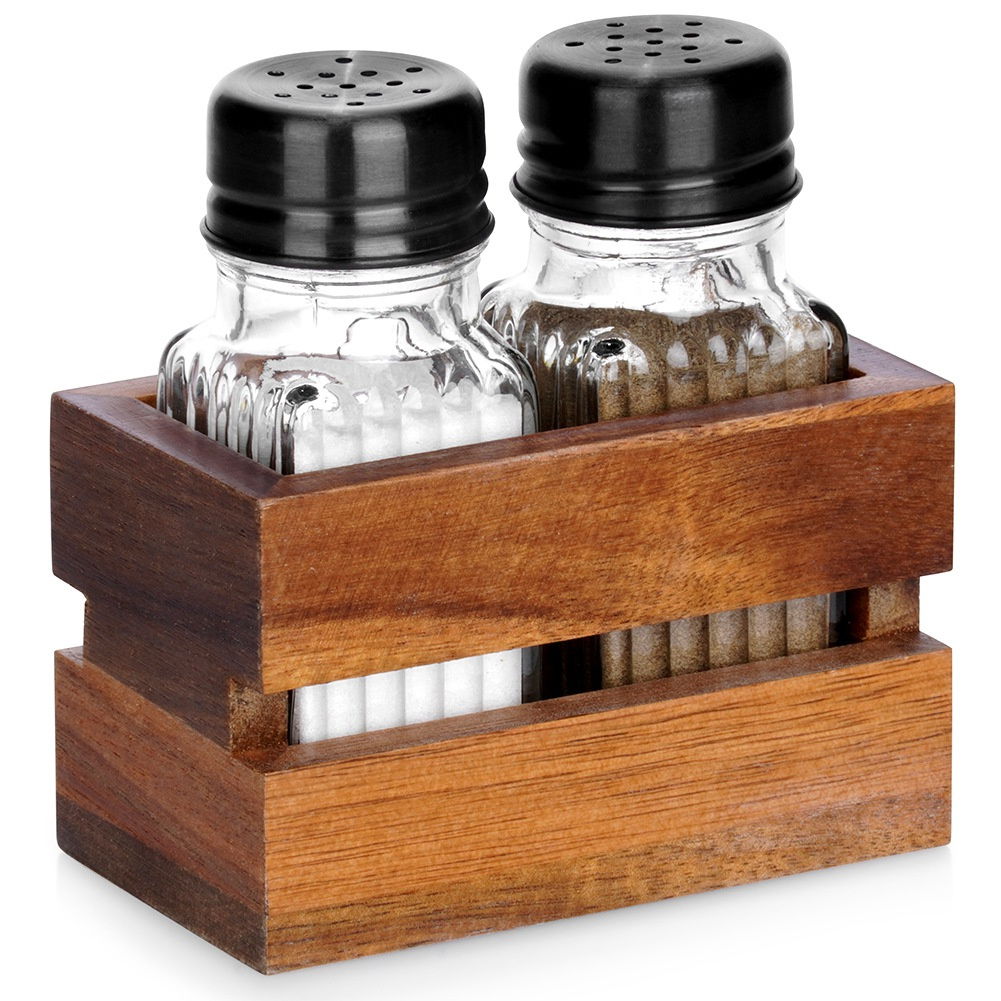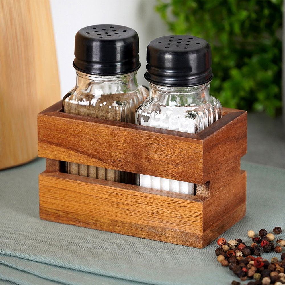 Solniczka i pieprzniczka wykonane ze szkła w przezroczystym kolorze. Umieszczone w praktycznym stojaku wykonanym z drewna akacjowego, który ułatwi serwowanie przypraw.