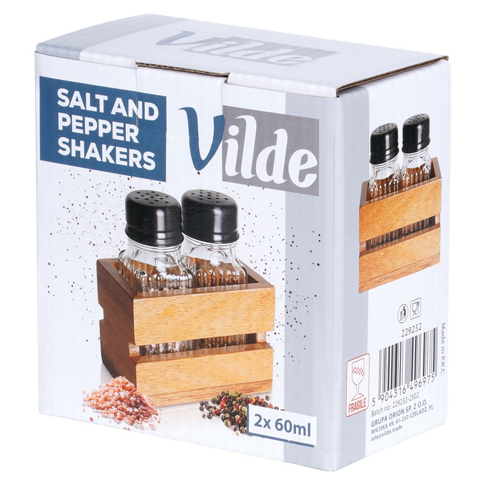 Zestaw solniczki i pieprzniczki w stojaku - Zestaw przyprawników składający się z dwóch pojemników do soli oraz pieprzu umieszczonych w stojaku. Wymiary każdego pojemnika wynoszą 3,5 x 3,5 x 9 cm, a pojemność każdego z nich to 60 ml. Stojak ma wymiary 9,8 x 5,5 x 6 cm, wysokość zestawu po włożeniu przyprawników to 10,5 cm. Solidnie wykonane - Pieprzniczka i solniczka wykonane są z grubego szkła w przezroczystym kolorze, posiadają ryflowaną powierzchnię. Zakrętki wykonane z metalu w czarnym kolorze. Stojak wykonany z drewna akacjowego. Praktyczny stojak w zestawie - Stojak zapewni wygodne przechowywanie i przenoszenie przyprawników, a dodatkowo solniczka i pieprzniczka będą miały swoje miejsce. Zamykane za pomocą praktycznej zakrętki z dziurkami. Otwory pozwolą dawkować odpowiednią ilość przypraw bez ryzyka dodania zbyt dużej ilości. Zamykanie przypraw sprawi, że zachowają na dłużej swoją świeżość i aromat. Przydatne w każdej kuchni - Sprawdzą się do przechowywania, podawania oraz dozowania przypraw. Dzięki nim przyprawy będą zawsze pod ręką. Przydatny zarówno w użytku domowym, jak i w gastronomii. Klasyczny design - Pieprzniczka i solniczka charakteryzują się prostą, ponadczasową formą, która doskonale komponuje się z każdą zastawą stołową. Zestaw dwóch pojemników składający się z solniczki i pieprzniczki, które są umieszczone w praktycznym stojaku. Wykonane z wytrzymałych materiałów. Wygodne dozowanie zapewnią otwory, które pozwolą uniknąć dodania zbyt dużej ilości przypraw. Dozowanie przypraw z pojemnika jest dużo wygodniejsze niż bezpośrednio z torebki. Oryginalny produkt marki Vilde. Wyprodukowano zgodnie z europejskimi standardami.