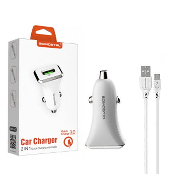 Somostel Ładowarka samochodowa USB + kabel USB - microUSB 3.1A 18W 1m Quick Charge QC3.0 Biały SMS-A43
