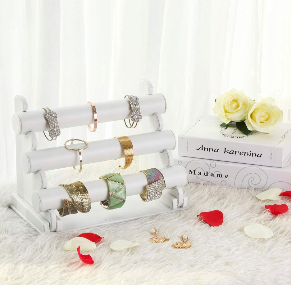 - ✴️Wysokiej jakości sztuczna skóra: Teksturowana sztuczna skóra dodaje eleganckiego i wyrafinowanego akcentu Twoim bransoletkom i zegarkom. Ten stojak na bransoletkę wzbogaci każdy dom, sprzedaż detaliczną biżuterii lub pokazy rzemieślnicze