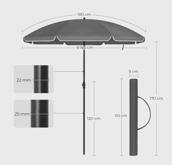 SONGMICS Parasol na plażę, Ø 160 cm, parasol ogrodowy GPU060G01 szary