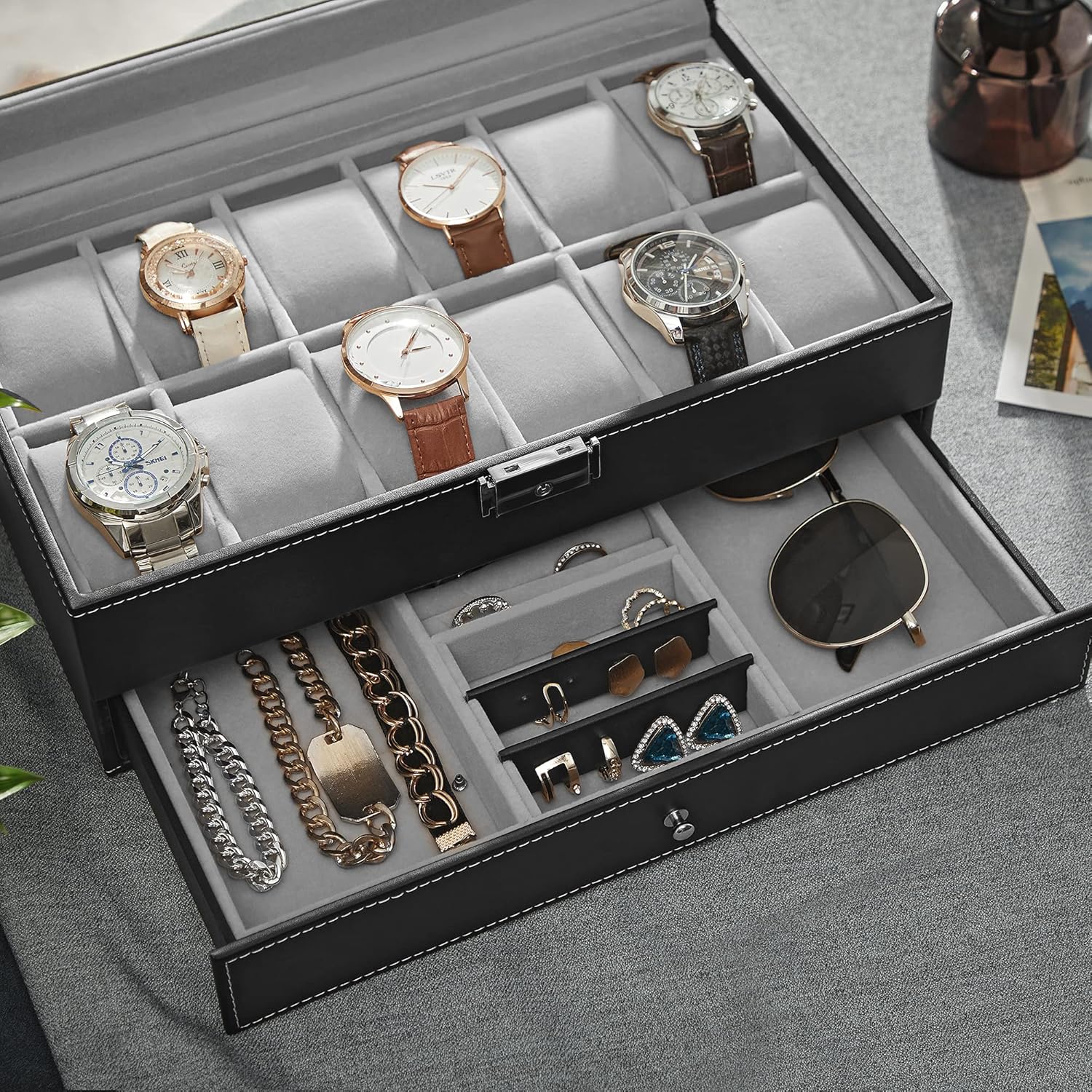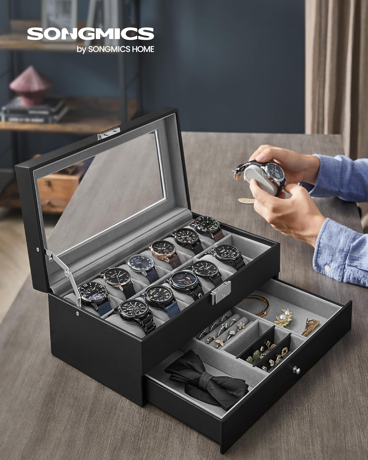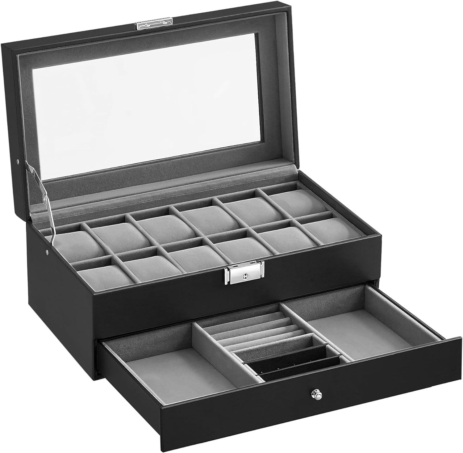 SONGMICS Pudełko na zegarki z 12 przegródkami, szklana pokrywa, zamykane, 2 poziomy, 1 szuflada, na pierścionki/bransoletki