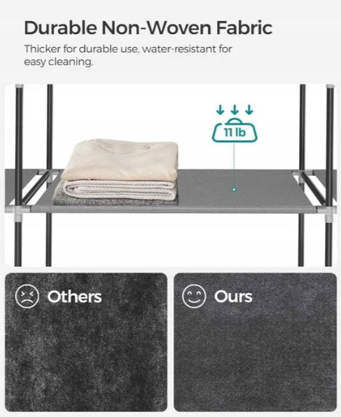 - ✴️[Doskonała stabilność] Szafa na ubrania wykonana jest z wytrzymałych metalowych rur o średnicy 16 mm, wysokiej jakości łączników z tworzywa sztucznego i włókniny 120 g/m². Drążek do zawieszania wytrzymuje do 15 kg, a każdy poziom regału do 5 kg